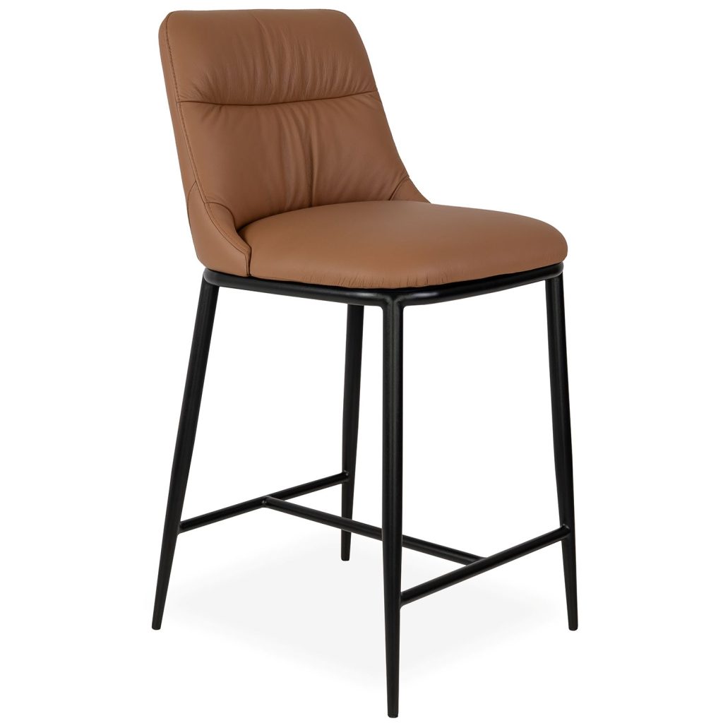 The Ryder Counter Stool features cognac brown leather upholstery, slim black metal legs, and a rounded backrest that curves gently down to the sides of the seat. Ryder's backrest is adorned with accent stitching and has a pillowy feel that facilitates relaxation and conversation at your counter, kitchen island, or home bar. Part of Copenhagen's Essentials Collection, Ryder's versatile style and superior comfort will enhance any dining setup.