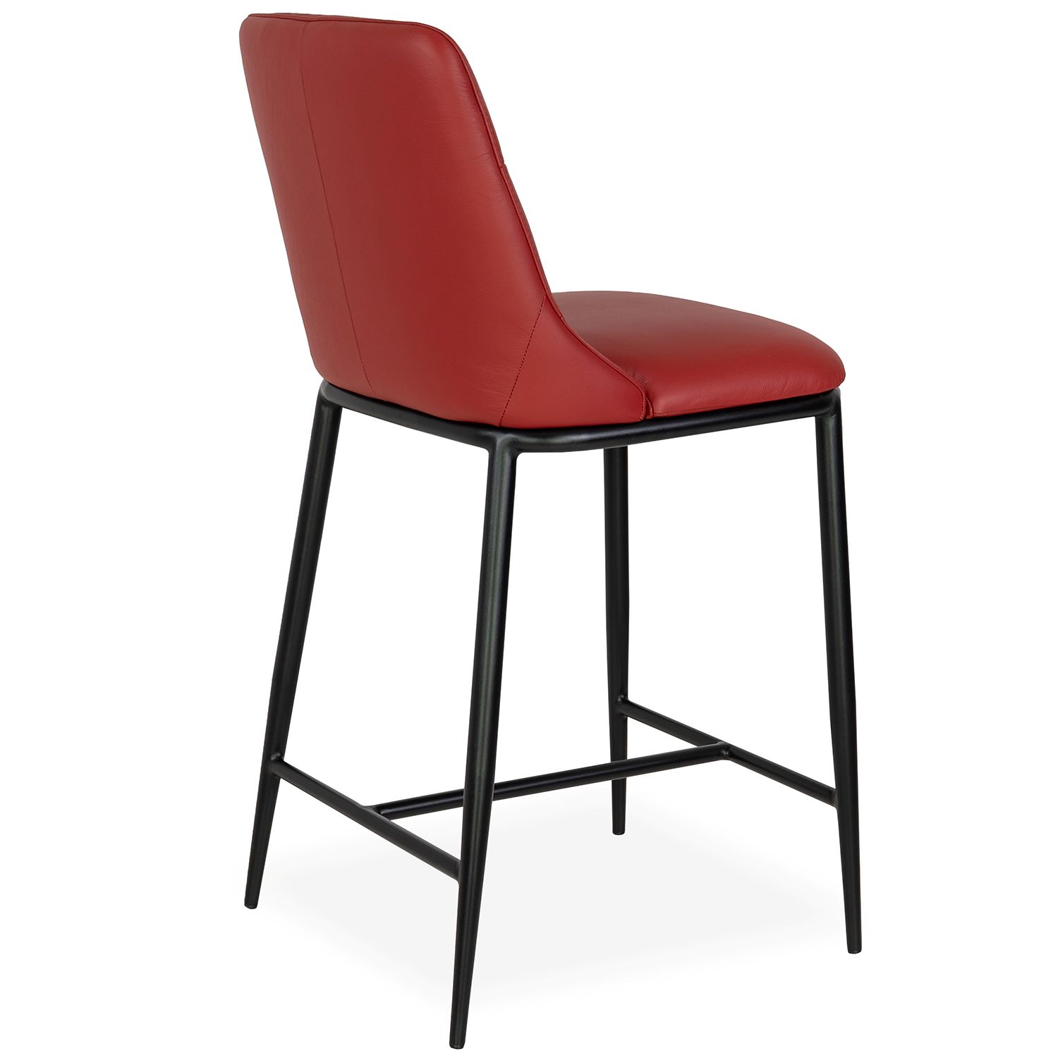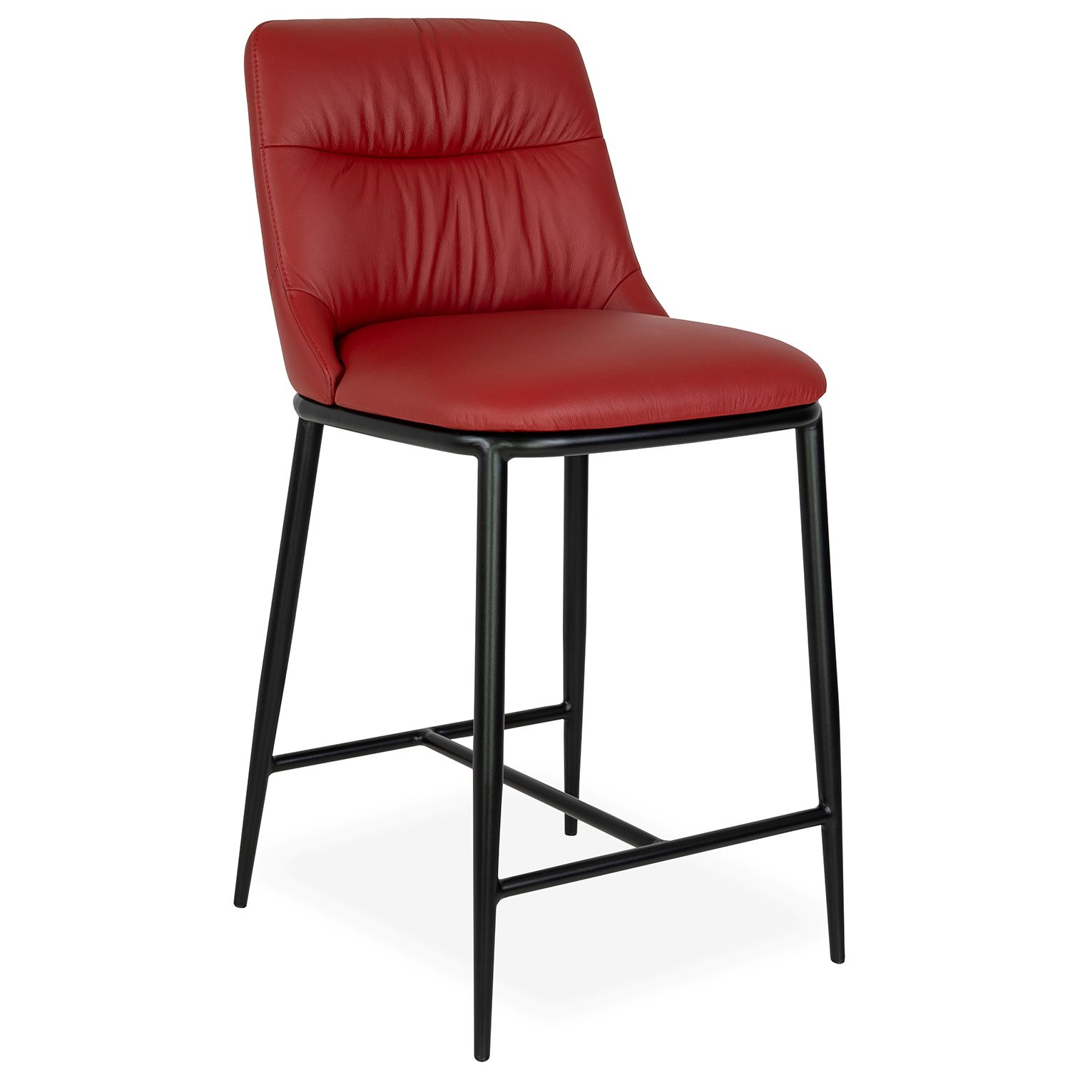 The Ryder Counter Stool features chic red leather upholstery, slim black metal legs, and a rounded backrest that curves gently down to the sides of the seat. Ryder's backrest is adorned with accent stitching and has a pillowy feel that facilitates relaxation and conversation at your counter, kitchen island, or home bar. Part of Copenhagen's Essentials Collection, Ryder's versatile style and superior comfort will enhance any dining setup.