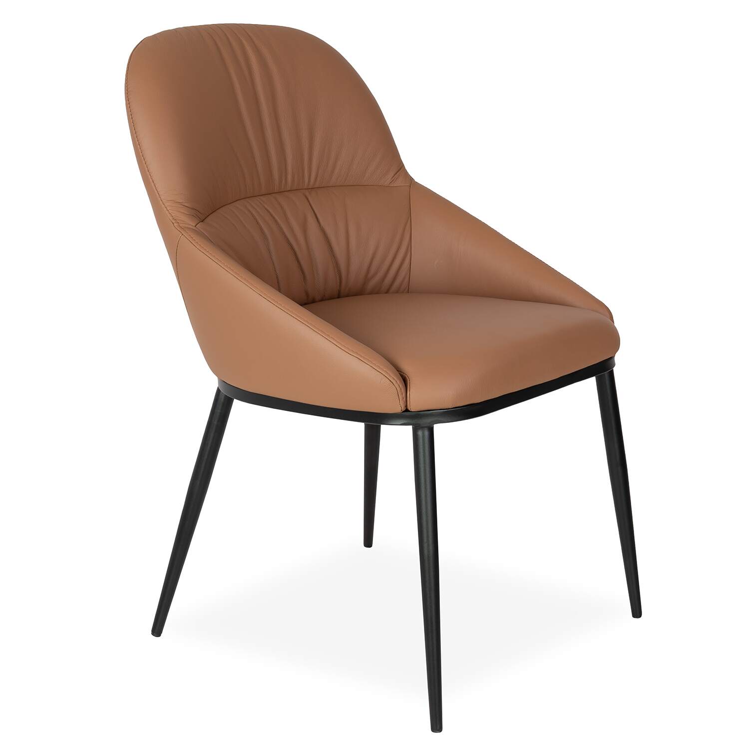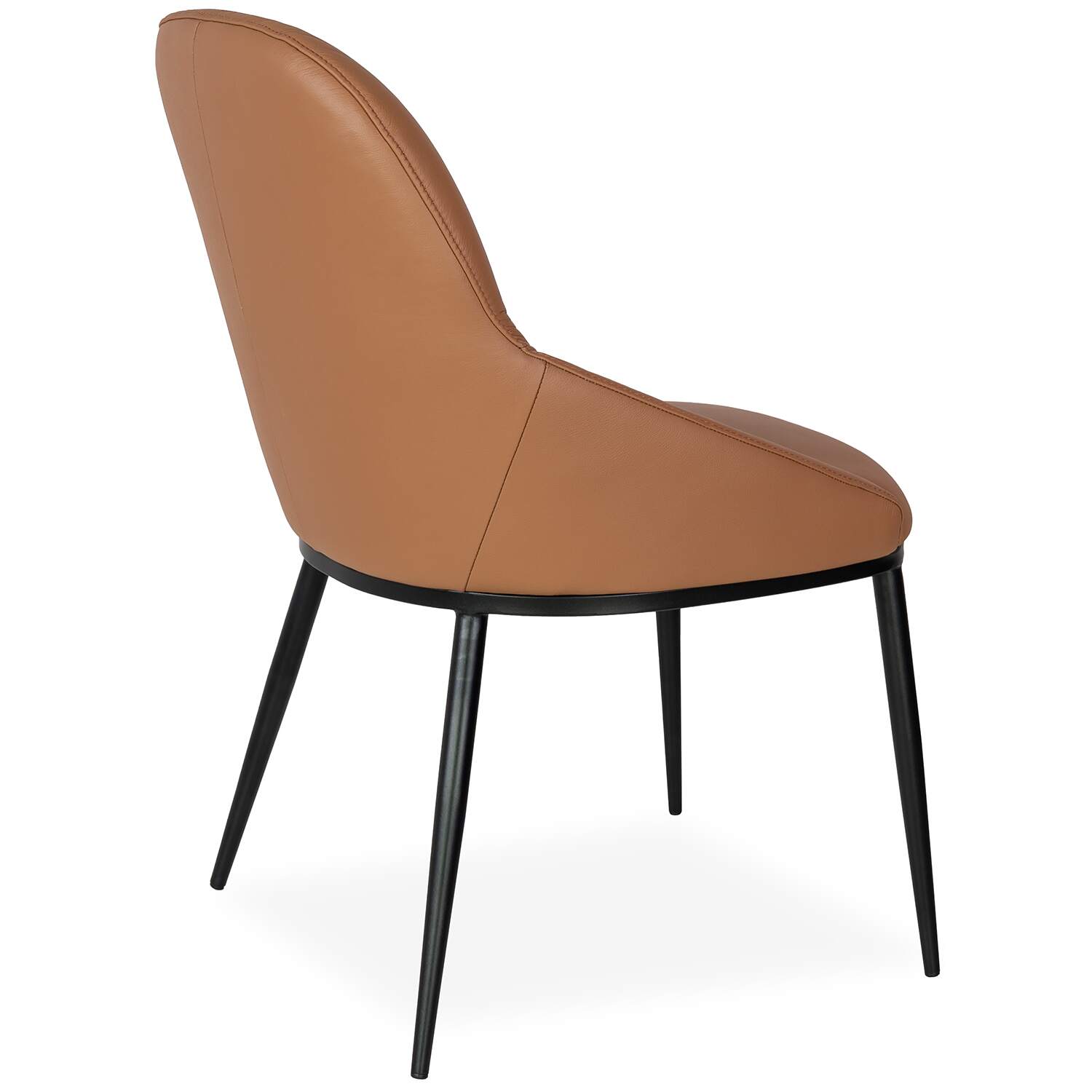 The Ryder Dining Chair features cognac brown leather upholstery, slim black metal legs, and a rounded backrest that curves gently down to the sides of the seat. Ryder's backrest is adorned with accent stitching and has a pillowy feel that facilitates relaxation and conversation at the dinner table. Part of Copenhagen's Essentials Collection, Ryder's versatile style and superior comfort will enhance any dining setup.