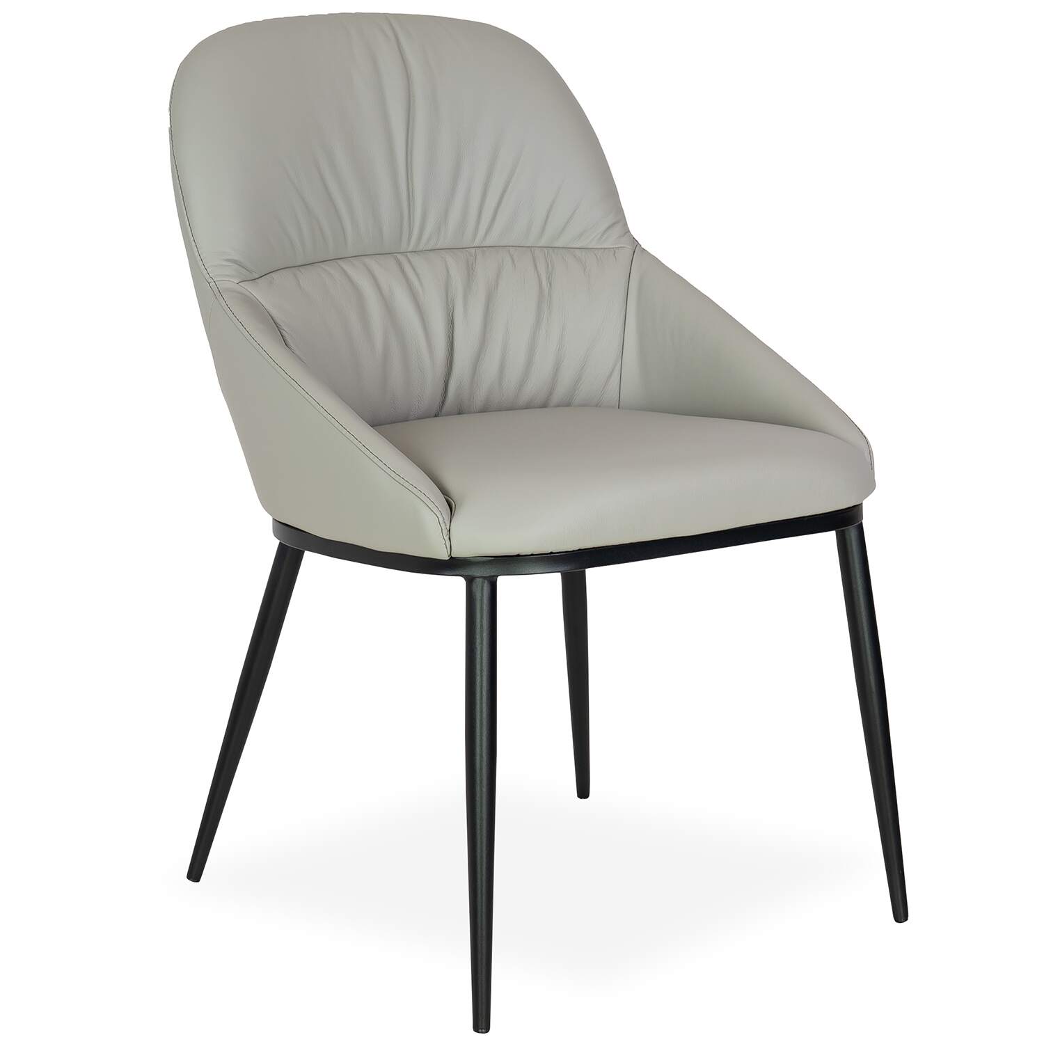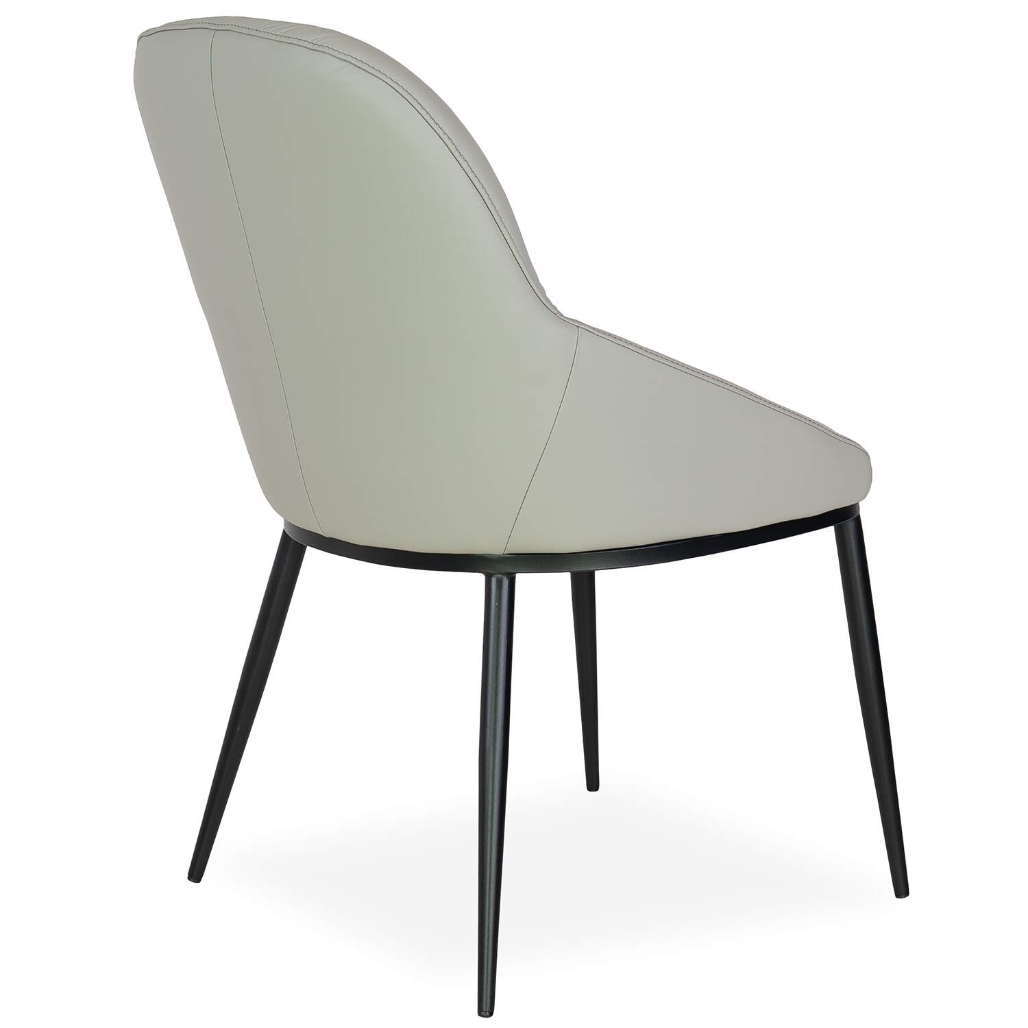 The Ryder Dining Chair features pewter grey leather upholstery, slim black metal legs, and a rounded backrest that curves gently down to the sides of the seat. Ryder's backrest is adorned with accent stitching and has a pillowy feel that facilitates relaxation and conversation at the dinner table. Part of Copenhagen's Essentials Collection, Ryder's versatile style and superior comfort will enhance any dining setup.