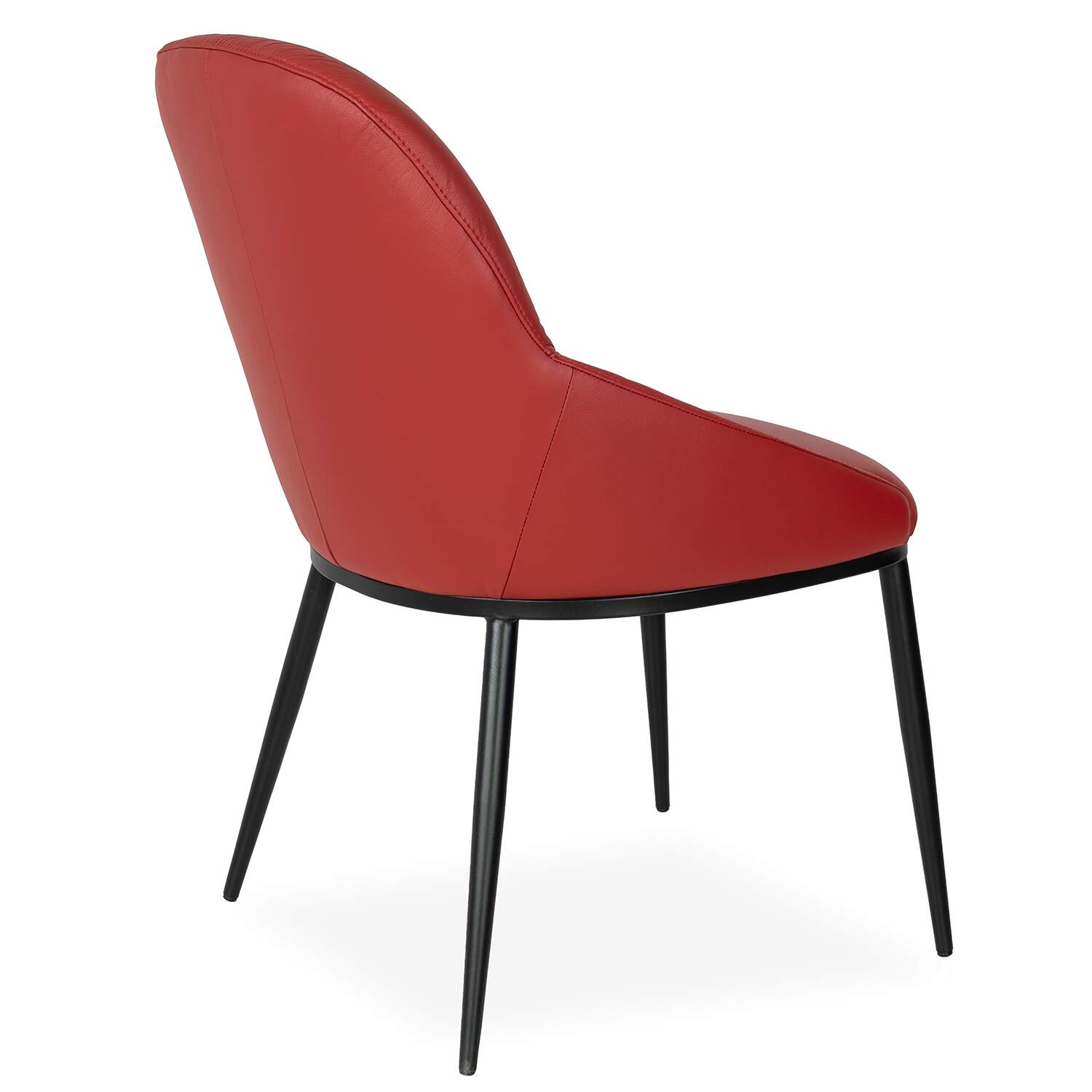 The Ryder Dining Chair features chic red leather upholstery, slim black metal legs, and a rounded backrest that curves gently down to the sides of the seat. Ryder's backrest is adorned with accent stitching and has a pillowy feel that facilitates relaxation and conversation at the dinner table. Part of Copenhagen's Essentials Collection, Ryder's versatile style and superior comfort will enhance any dining setup.