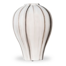 [0] => The Sabino Vase is made of porcelain and hand-painted with vertical stripes in soft tones of beige, brown, and grey on an off-white background. Its neutral color scheme and tall, rounded urn shape make Sabino a graceful complement for a wide range of interiors.