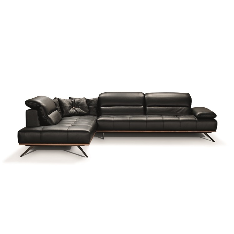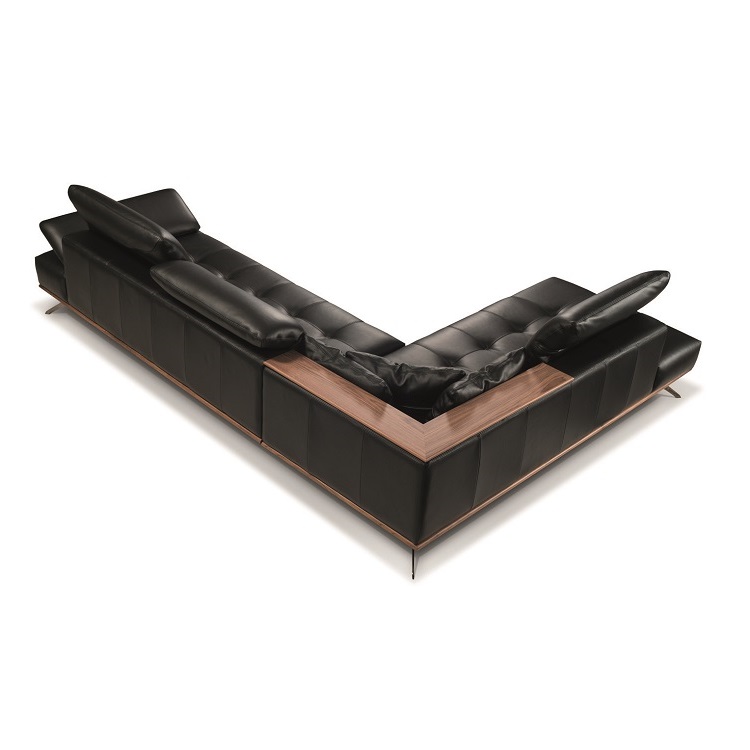[0] => The Sabrina Sectional, available in black natural leather with matching stitching, is a stunning contemporary sectional that represents the best of Italian style. Designed with both aesthetics and comfort in mind, the Sabrina makes a sophisticated statement with light tufting on its seat cushions and a beautiful canaletto walnut shelf and frame. The headrests and armrests adjust to maximize the comfort of you and your guests.