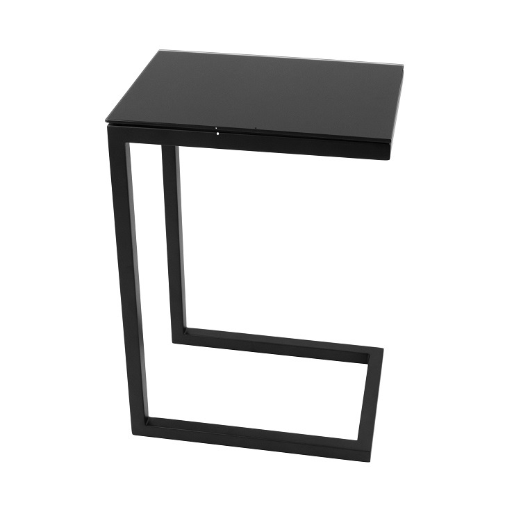 The Safari table is a clean, minimalist end table with bold lines and sharp angles. The table has a black powder coated steel tube frame with a black painted matte tempered glass top.