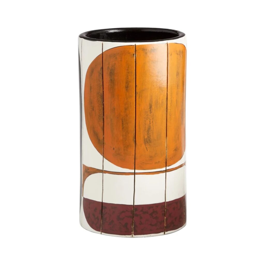 Bring a mod and earthy touch to your interior with the Small Sakura Vase, featuring contrasting shades of brown, orange, black, and off-white. Made of glazed ceramic, this vase sports a design with elongated ovals and circles reminiscent of modern art, as well as carved lines in its surface for additional texture. Sakura's black glazed interior means it can hold fresh or artificial flowers, or stand on its own in a modern home or office.