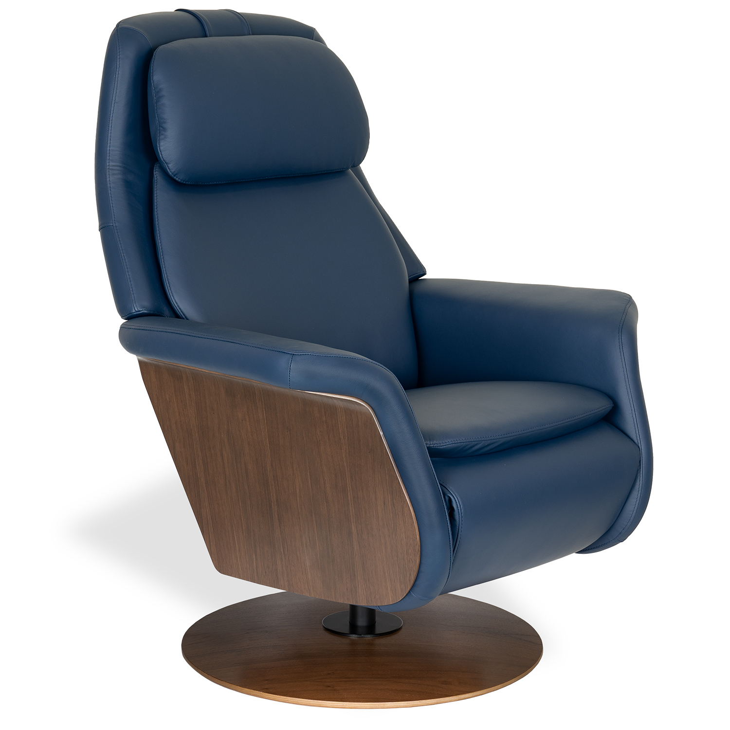 From Stressless® of Norway comes the Sam Wood Power Recliner, engineered to give you your greatest comfort yet. Sam features Oxford blue Paloma leather upholstery with eye-catching side panels in walnut veneer, supported by a matching disc base. Soft, sleek lines and ample padding allow for hours of relaxation, while French seam detailing adds a tailored look.