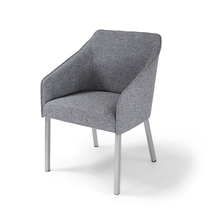[0] => The Sara II Lowback Dining Chair blends contemporary style with a cozy look and durable build. Upholstered in grey "Venue Ground Pepper" polyester fabric, Sara has a squared back that slopes down into angled arms, and a padded seat supported by silver metal legs. With upholstery tested to withstand 102,000 double rubs, Sara will resist wear and tear while bringing modern comfort to your dining room.