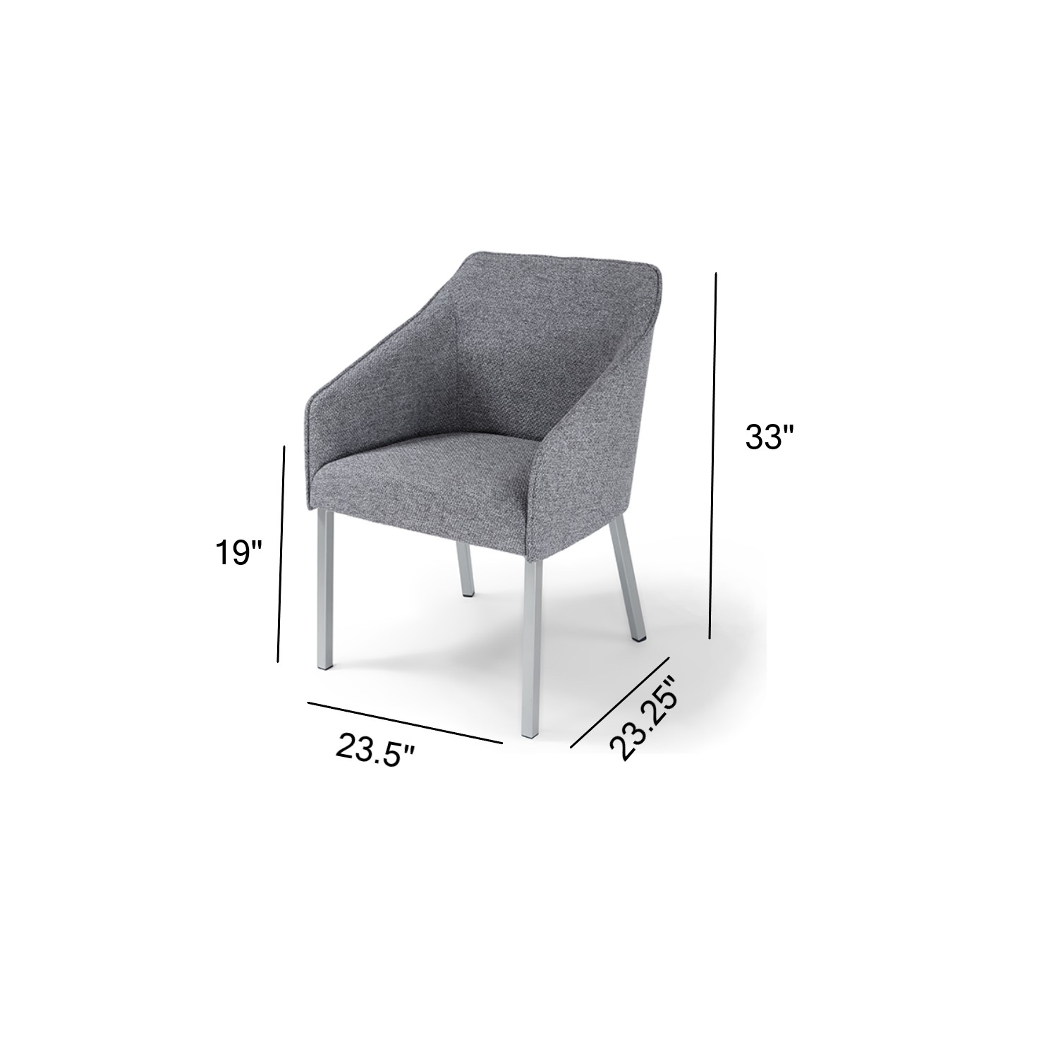 The Sara II Lowback Dining Chair blends contemporary style with a cozy look and durable build. Upholstered in grey "Venue Ground Pepper" polyester fabric, Sara has a squared back that slopes down into angled arms, and a padded seat supported by silver metal legs. With upholstery tested to withstand 102,000 double rubs, Sara will resist wear and tear while bringing modern comfort to your dining room.