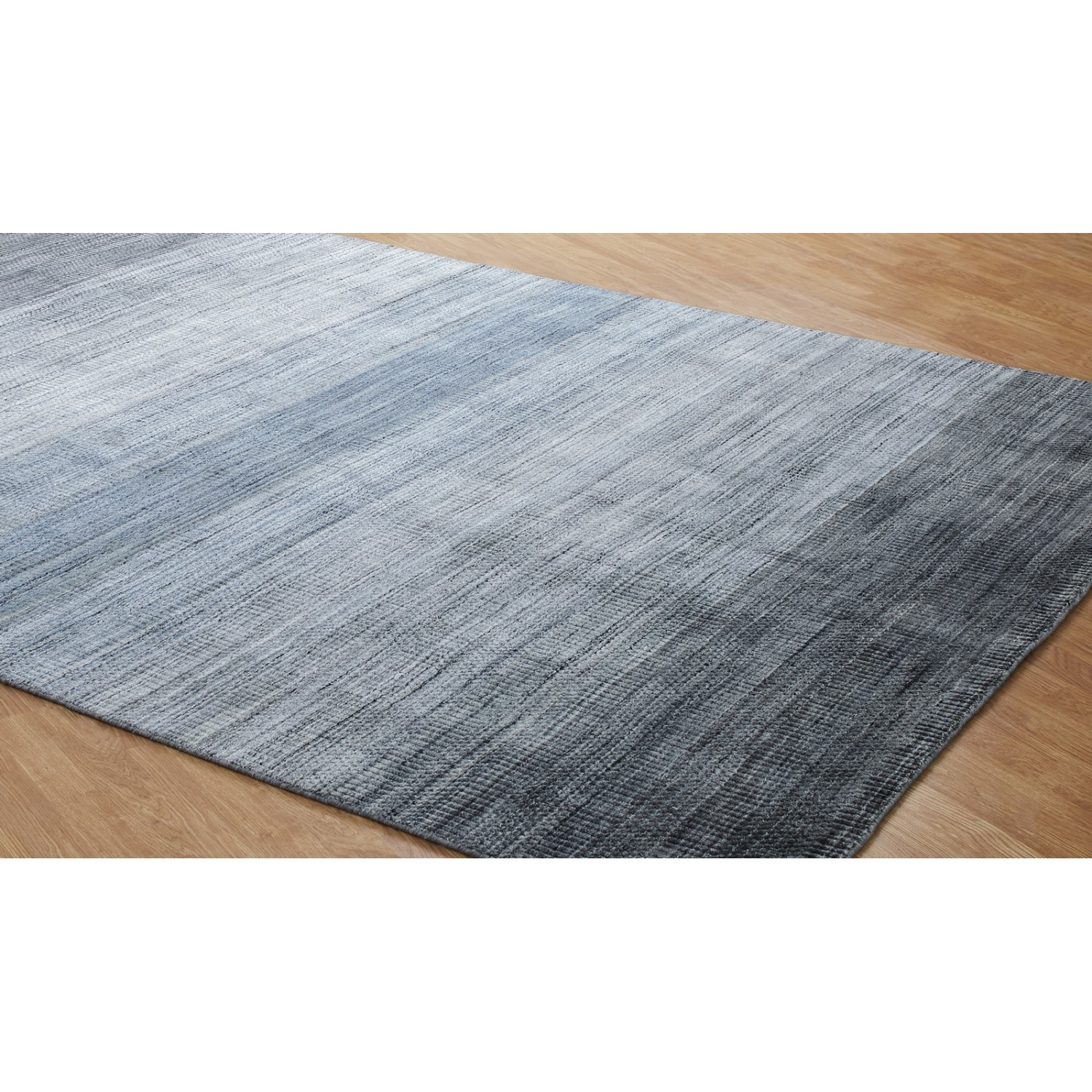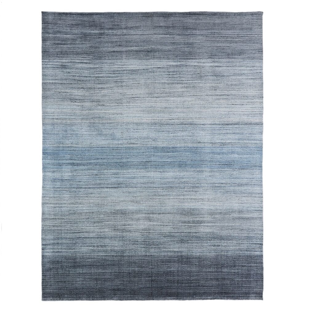 The Sassi rug is contemporary with variegated tones of soft grey and deep blue. Sassi is handcrafted with with wool and Silkette, silk-like viscose yarns, against a natural cotton backing in a Lori-Loom weave.