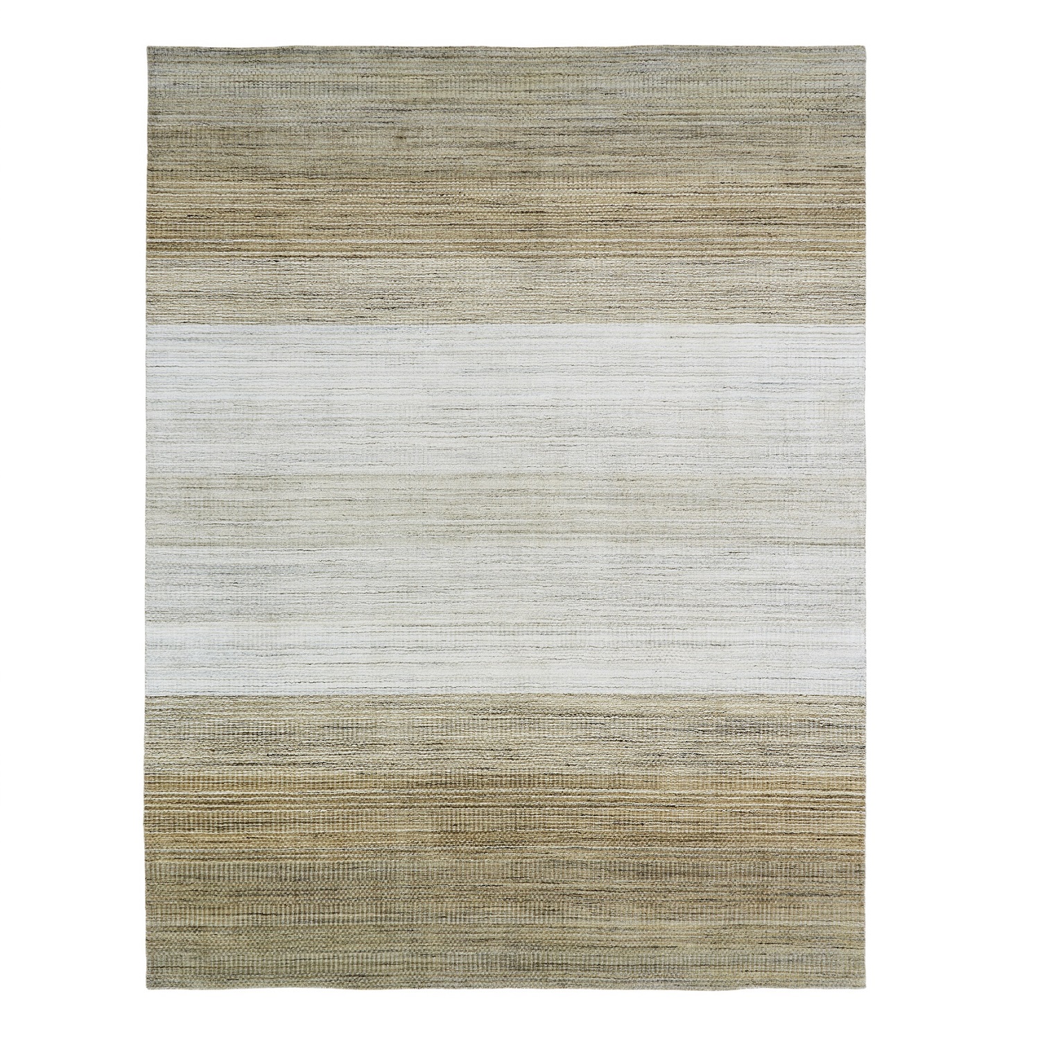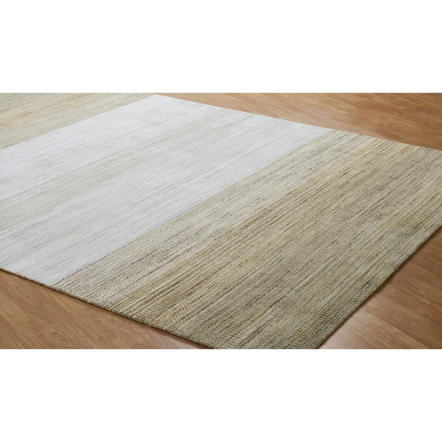 The Sassi rug is contemporary with variegated tones of white and taupe. Sassi is handcrafted with with wool and Silkette, silk-like viscose yarns, against a natural cotton backing in a Lori-Loom weave.