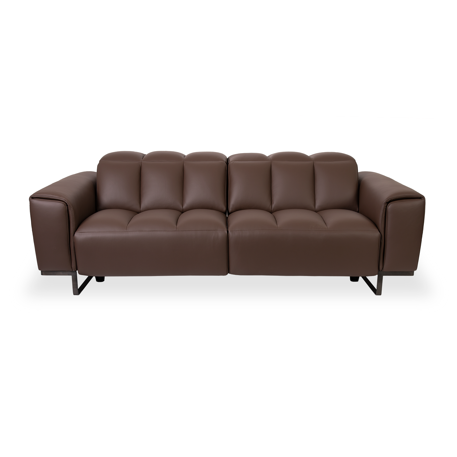The Savona Sofa, made in Italy, features smooth chocolate Boston leather, angular metal legs, and power motion seats with adjustable headrests and footrests for a stunning and contemporary look. Striking channel tufting creates elegant, side-by-side curves in the back and seat cushions that bolster the body, while the subtle silhouette of the legs provides sleek contrast against the thick cushions and wide armrests. Savona will be a stylish, eye-catching addition to any living space.