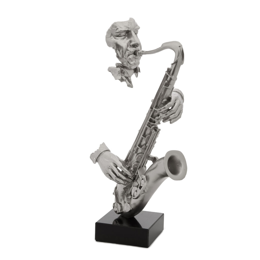The Sax Player Sculpture is truly an artistic piece, with the figure of a musician formed with careful detail. The shiny, liquid-like appearance is further enhanced by the diminshing parts of his body, creating a figure flowing through water, through air, through song.