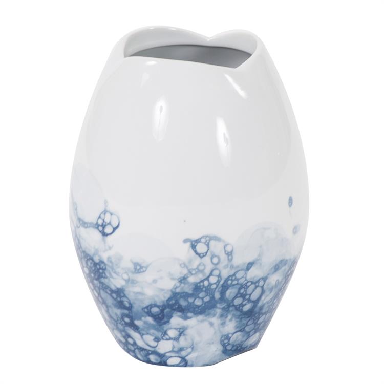 [0] => The Scalloped vase, crafted from blue and white porcelain, has a graceful shape and subtle blue circle pattern.