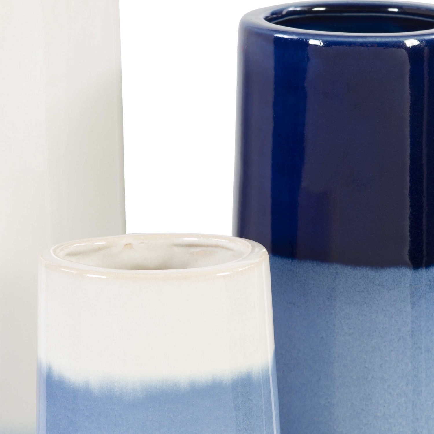 [0] => The Sconset Vases come in a set of three and feature layered stripes of white, light blue, and navy glaze. Tall and slender, these earthenware vases bring a subtle splash of color to any living or office space.