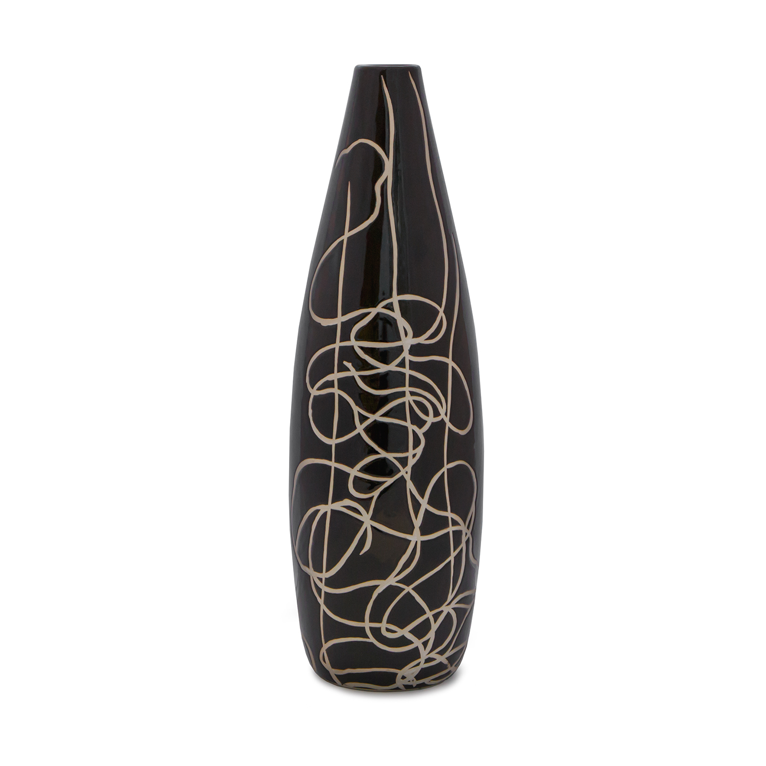 [0] => Inspired by a collection of charcoal drawings, the Scribbled Ceramic Large Vase features a bold, curling white design etched into a glossy black ceramic body. The perfect minimalist accent to any design environment, this vase can be displayed on its own as an art piece or hold flowers and other greenery.
