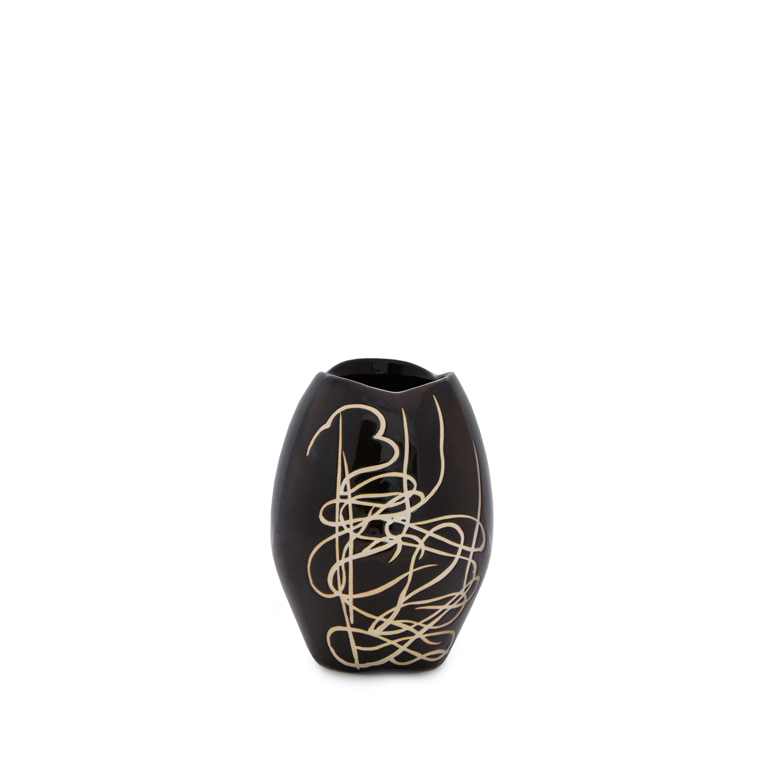 Inspired by a collection of charcoal drawings, the Scribbled Ceramic Small Vase features a bold, curling white design etched into a glossy black ceramic body. The perfect minimalist accent to any design environment, this vase can be displayed on its own as an art piece or hold flowers and other greenery.