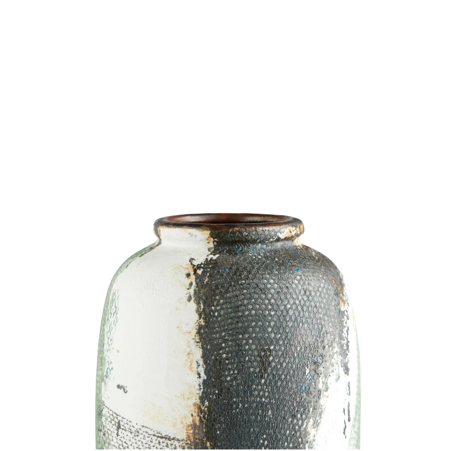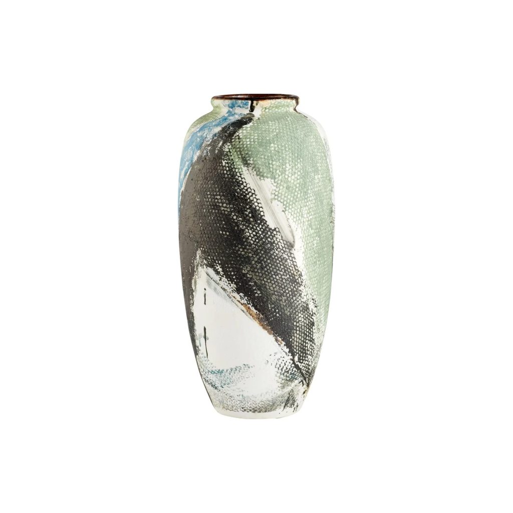 The Large Seabrook Vase features shades of light green, sky blue, and charcoal whose rich colors were achieved through a high-temperature firing process with complex reactive glazes. An overlay applied during the firing process results in a unique net-like texture. With its urn-like shape and eye-catching exterior, the Seabrook Vase will accentuate any modern home.