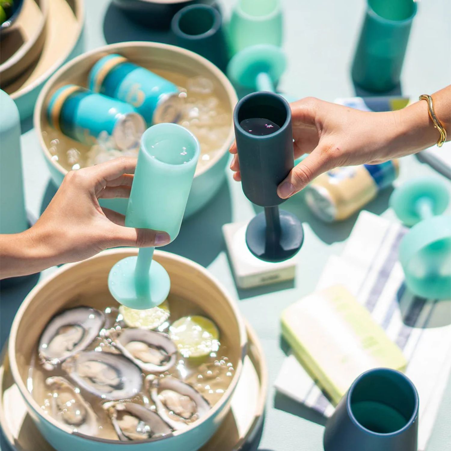 Add a splash of fun to your dining and cocktail experience with the Seff Silicone Champagne Flutes, sold as a pair in sophisticated shades of mist blue and dark, inky teal. Designed in Australia from FDA approved food-grade silicone, these unbreakable glasses are lightweight, portable, and outdoor-friendly. They are also safe for hot drinks, dishwasher, and freezer thanks to their ultra-durable construction. A sustainable alternative to single-use drinkware, Seff is perfect for picnics, poolside, camping, festivals, and a plethora of other entertaining occasions.