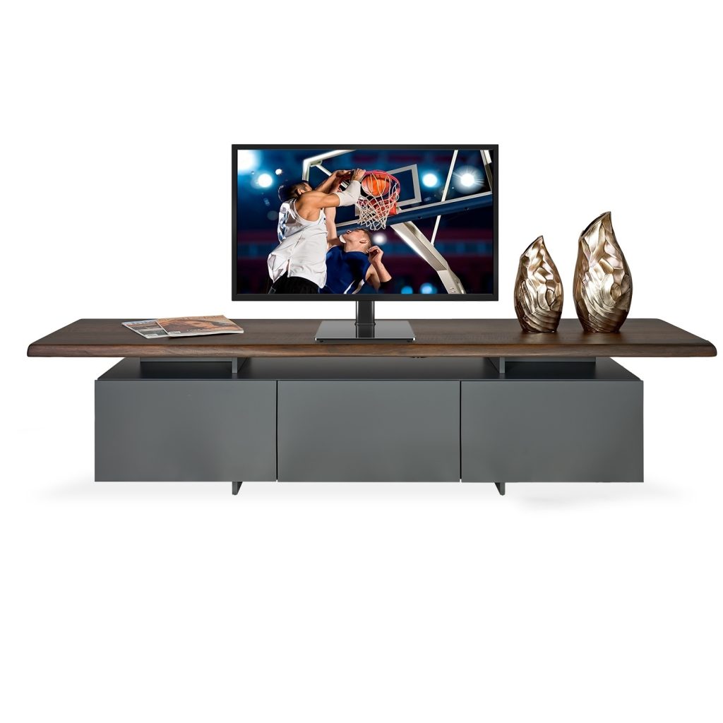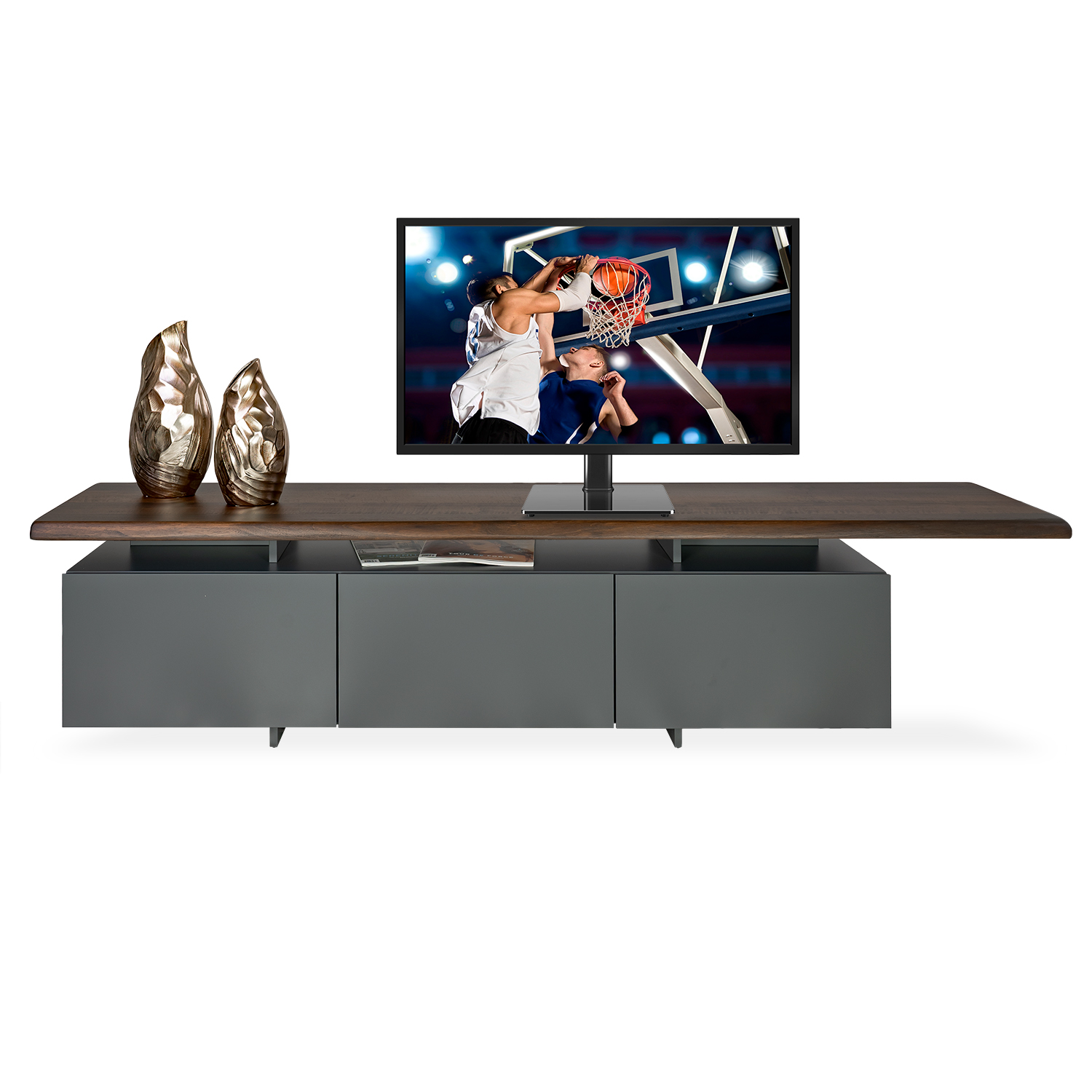 With graphite-painted wooden doors and a burned oak top, the Seneca TV Stand will bring refined, elegant design to your living space. Made in Italy, this TV stand features three doors, a graphite interior, and an open storage shelf for remotes, magazines, and other everyday objects -- ensuring that you have enough room to store your media essentials. Seneca's wooden top has an organically shaped edge that gives it a natural look, and can be mounted in either a centered position or asymmetrically out to either side for customized style.