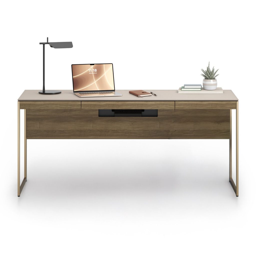 Designed by Matthew Weatherly, the Sequel Studio Desk forms the foundation of the BDI Sequel Studio office collection. Sleek and refined, this desk pairs a beige satin-etched glass top with a durable body in neo walnut veneer, accentuated by bronze-finished legs. A drawer with a flip-down front can support a keyboard and mouse as well as store everyday essentials. The tilting cable management panels offer direct access to an integrated power strip with outlets and USB connections, while wire straps keep cords out of sight, so the work surface stays composed.