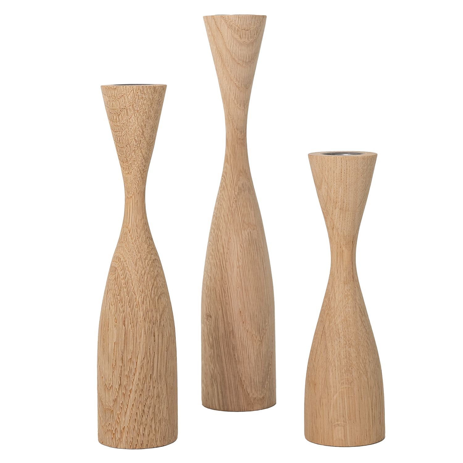 Handmade in Denmark from repurposed wood, the Set of 3 Shaped Candlesticks brings clean elegance to your table, sideboard, or mantel with their hand-turned hourglass shape and natural oak finish. Each candlestick has a different height to create a variegated display, and a removable metal insert so that used candles can be easily replaced.