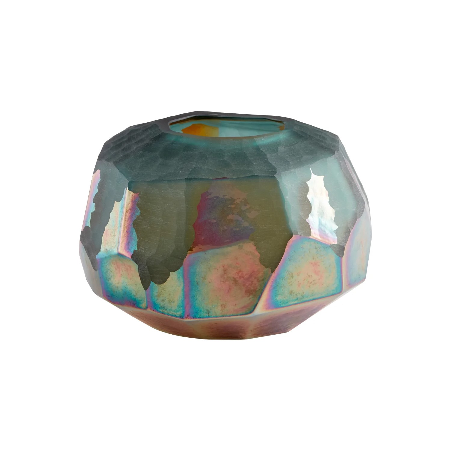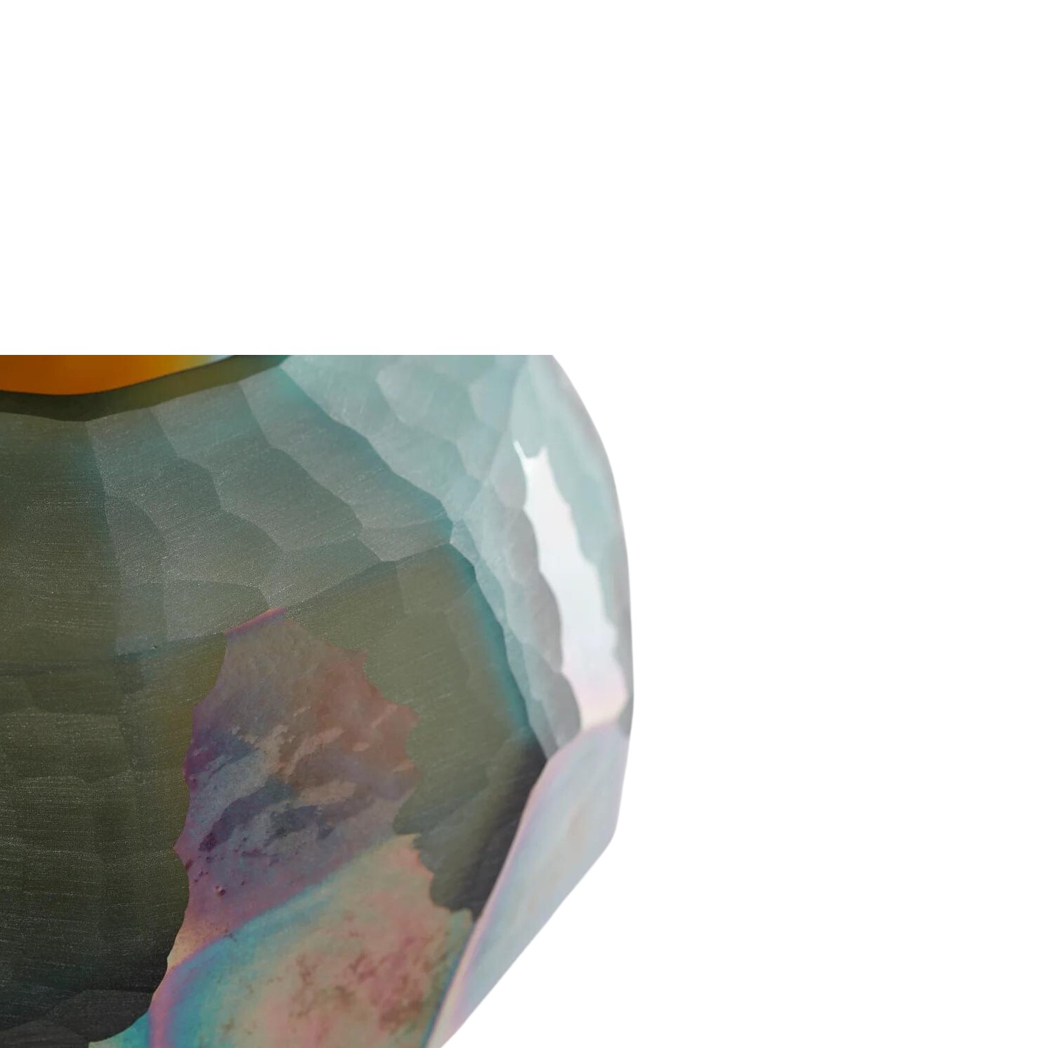 The Short Roca Verde Vase features a vibrant two-toned surface with shades of green, gold, and everything in between. The iridescent finish on the lower half of the vase forms a stunning complement to the more muted green above. With a faceted, geometric shape reminiscent of natural rock formations, Roca Verde is an artistic statement from top to bottom.