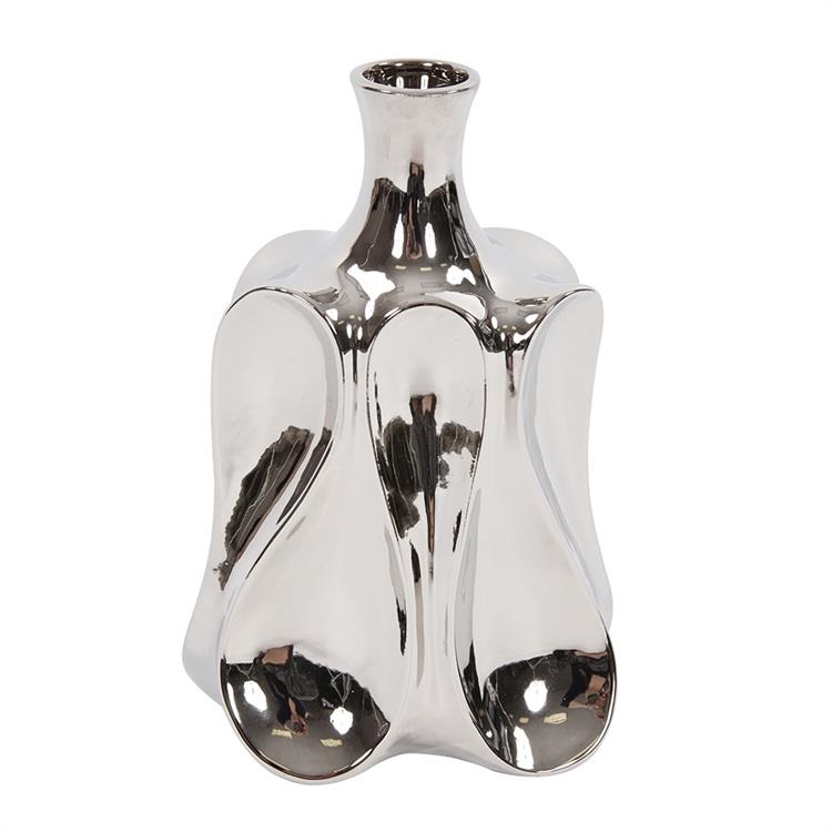 [0] => The Silver Bottle vase, made from ceramic, features a shiny metallic finish with a mirrored effect. The vase has an exaggerated wave design that adds a touch of abstract, whimsical style.