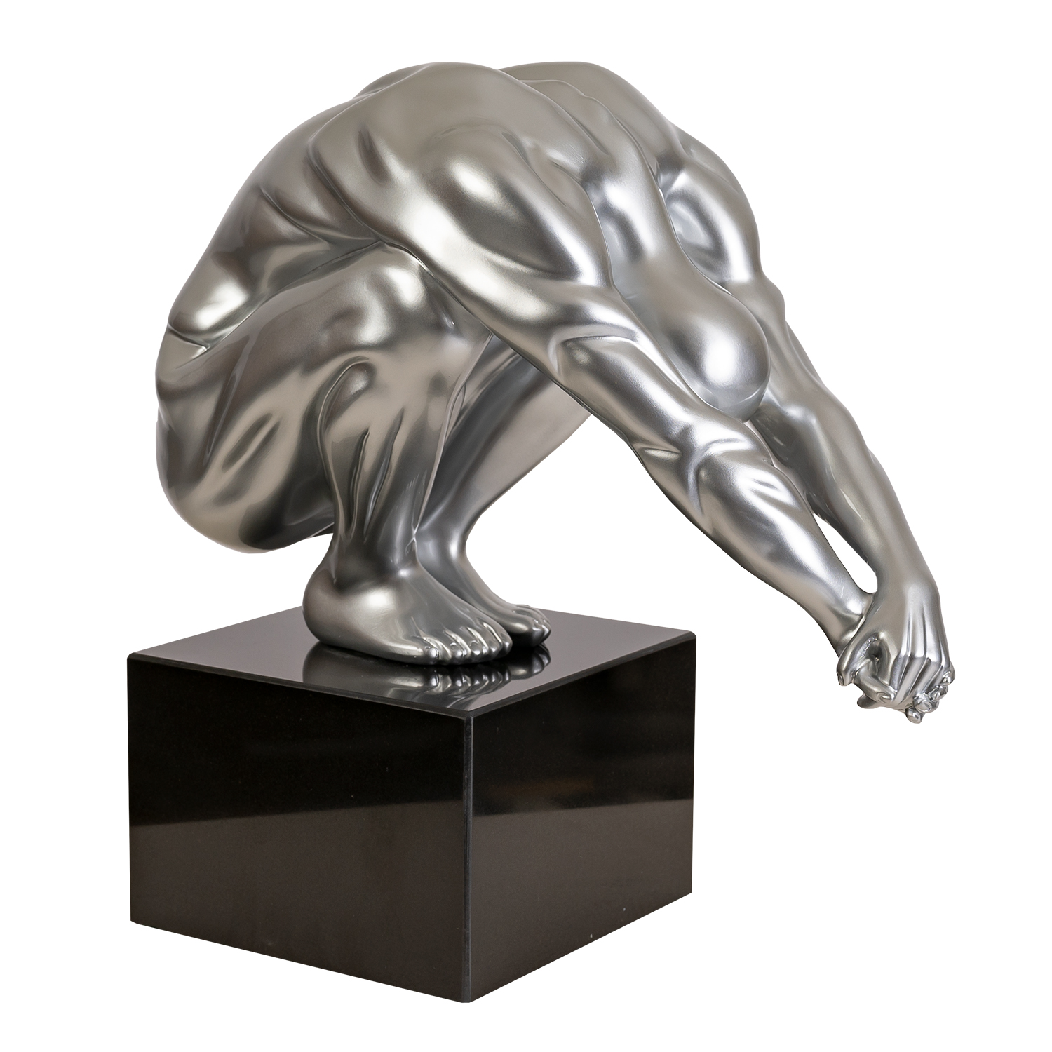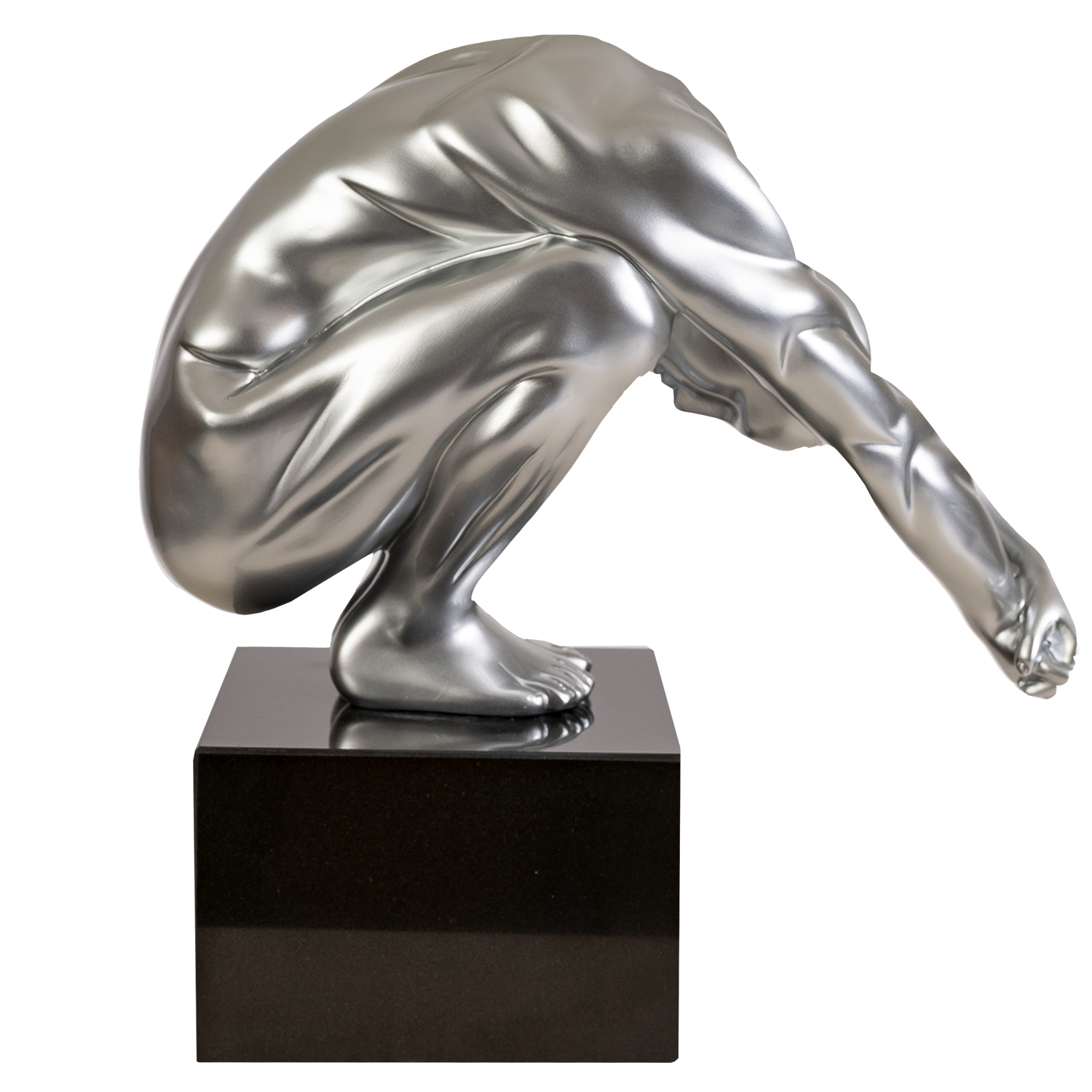 The Silver Diver Sculpture depicts a figure crouched forward with arms extended and hands clasped together, as though preparing to dive. Crafted from polyresin, this sculpture sports a metallic silver hue and a muscular form that evokes a sense of strength, grace, and potential energy. A cubic black base makes the Silver Diver ready to display.