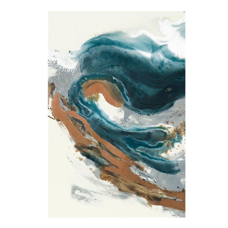 [0] => The Silvery Wave I wall art brings abstract design and flowing patterns to your home or office space, with deep blue, rich coppery gold, and bright white melting together to create the impression of swirling water. Dynamic and eye-catching, Silvery Wave I will stand out in any design environment. This painting is on gallery wrapped canvas with metallic accents.