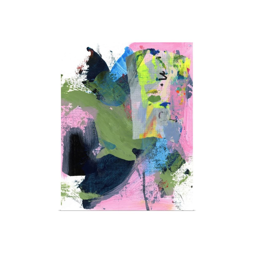[0] => Sketchbook, by Jessalin Beutler, is an abstract wall art that experiments with contrasting colors and textures reminiscent of graffiti or street art. Splotches of bubblegum pink, olive green, bright blue, neon yellow, and black lead the eye around the canvas, while a gridded pattern in the upper right creates an additional area of visual interest. A glossy finish adds the finishing touch to this fun and edgy artwork.