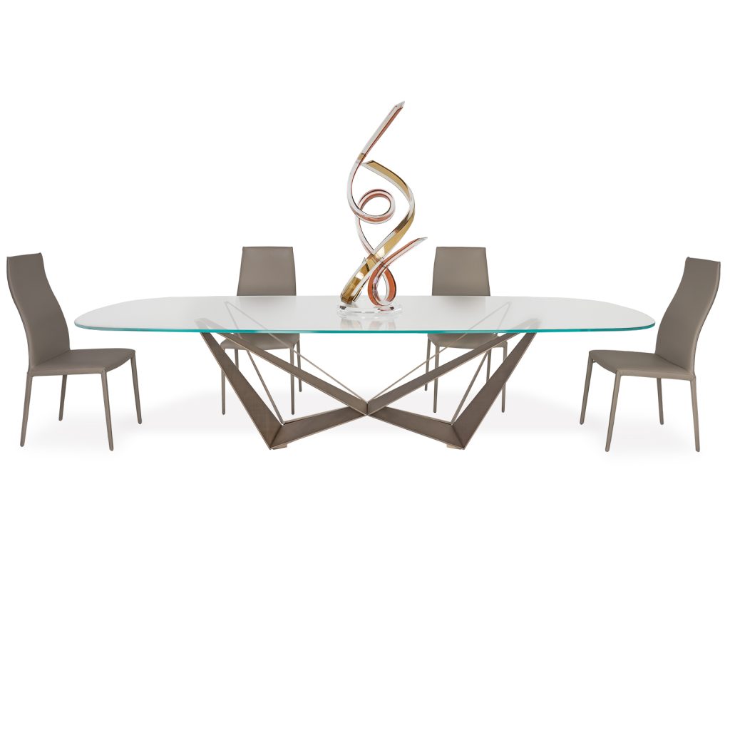 [0] => The Skorpio Dining Table by Cattelan Italia merges contemporary, cutting-edge design and functionality with bold artistry. Skorpio features a gleaming extra-clear glass top that allows a full view of the sculptural metal base with a brushed bronze finish. The vertices of the four triangular legs create both a contrast and a complement to the crisp edges and rounded corners of the tabletop. As a functional work of art, Skorpio will become the focal point of your dining space.
