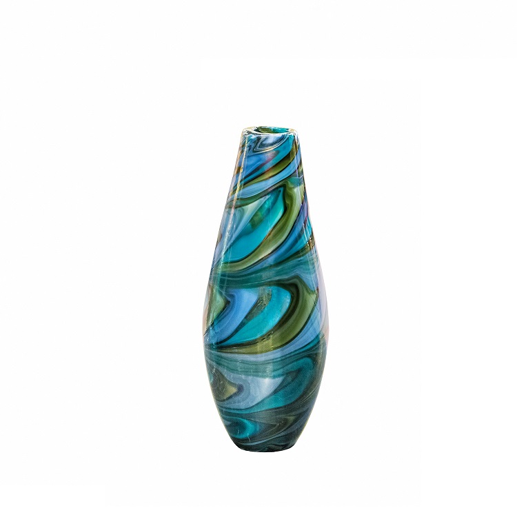 [0] => The small Chalcedony vase, crafted from multi-colored blue glass, evokes the beautiful striations and swirling colors of Chalcedony quartz.