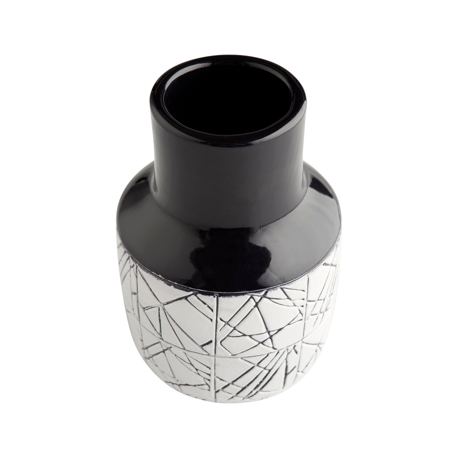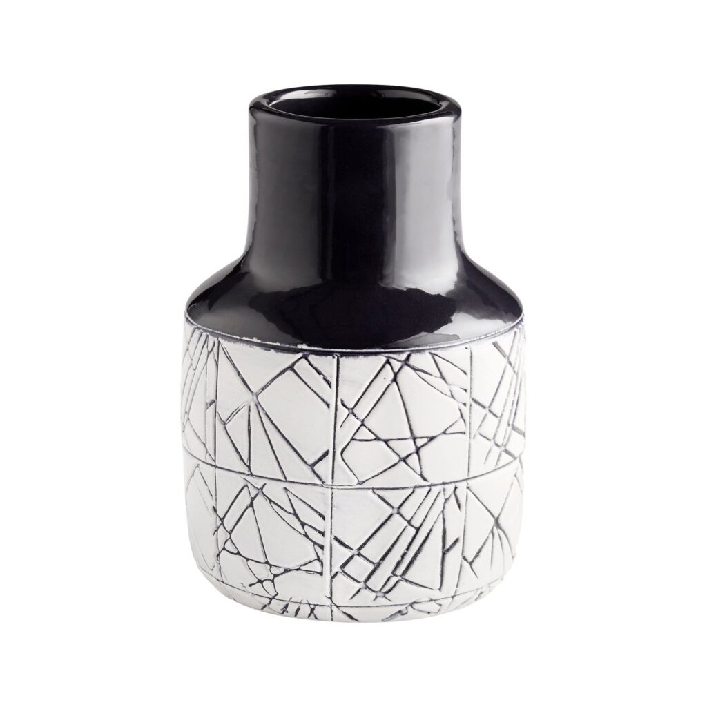[0] => The Small Dark Zenith Vase is made from ceramic and features a tall neck in black and a round body in white, with etched geometric designs in black providing dimension and texture. Place the Dark Zenith Vase on a shelf, credenza, or table by itself or with the Medium and Large Dark Zenith Vases to add chic, contemporary style to any space.