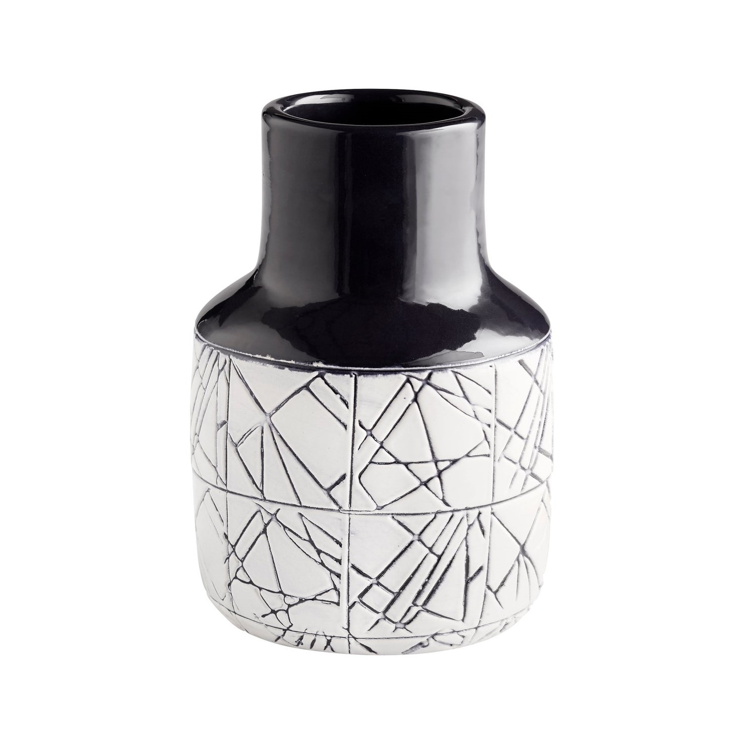 The Small Dark Zenith Vase is made from ceramic and features a tall neck in black and a round body in white, with etched geometric designs in black providing dimension and texture. Place the Dark Zenith Vase on a shelf, credenza, or table by itself or with the Medium and Large Dark Zenith Vases to add chic, contemporary style to any space.