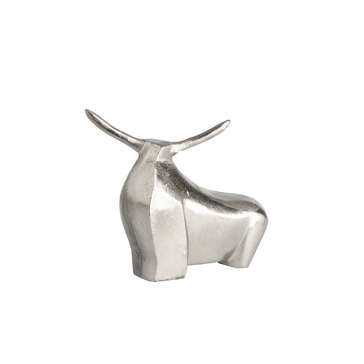 [0] => The Small Freeplay Sculpture, crafted from raw nickel and aluminum, portrays the figure of a proud, strong bull with broad horns using a touch of abstraction.