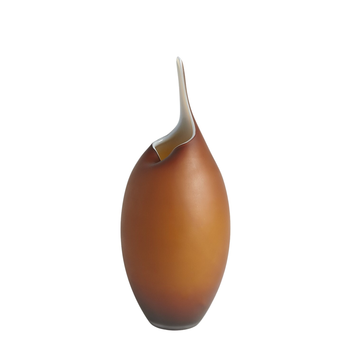 [0] => The Small Frosted Amber Vase features a uniquely organic, rounded silhouette with a matte amber exterior and a glossy light blue interior. Made of caned glass, each vase is hand-shaped in a still-molten state to form a soft divot and a tall, thin projection on opposite sides of its rim. Watertight glaze ensures you can display both fresh and artificial flowers in this striking vase.