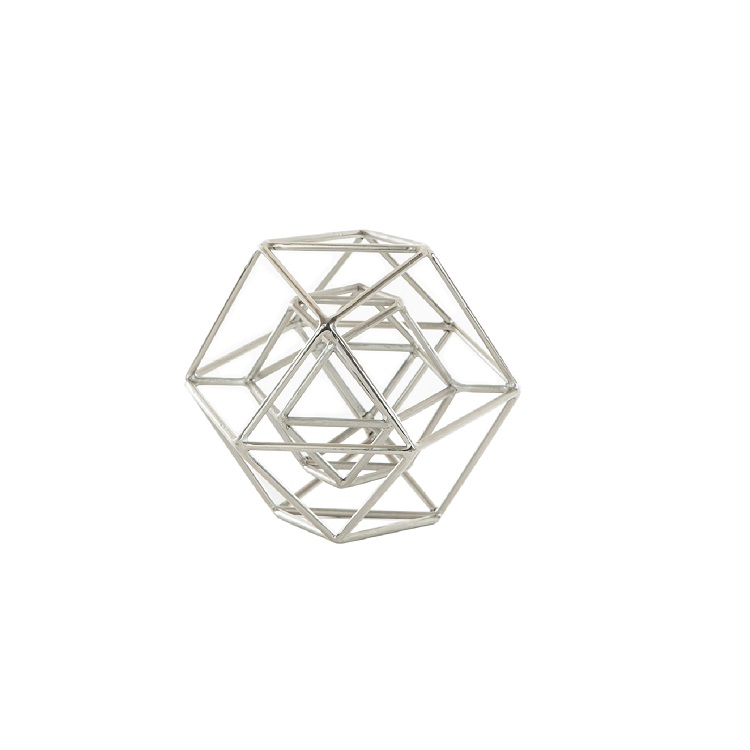 [0] => The Small Geo Sculpture has a nickel finish and is inspired by shapes found in science and nature. Its layered angular look is contemporary and minimalist, making it easy to integrate into a wide variety of spaces. Place the Geo Sculpture on your table, credenza, or bookshelf by itself or in combination with the Geo Sculptures in other sizes.