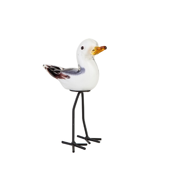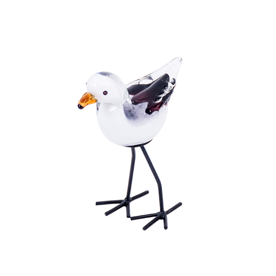 [0] => The Small Glass Seagull is delicate and charming, with a black and white body, orange beak, and slim metal legs. Its small eyes have an inquisitive look, and its lively yet minimalist design is the perfect way to add a touch of nature and color to any living space.