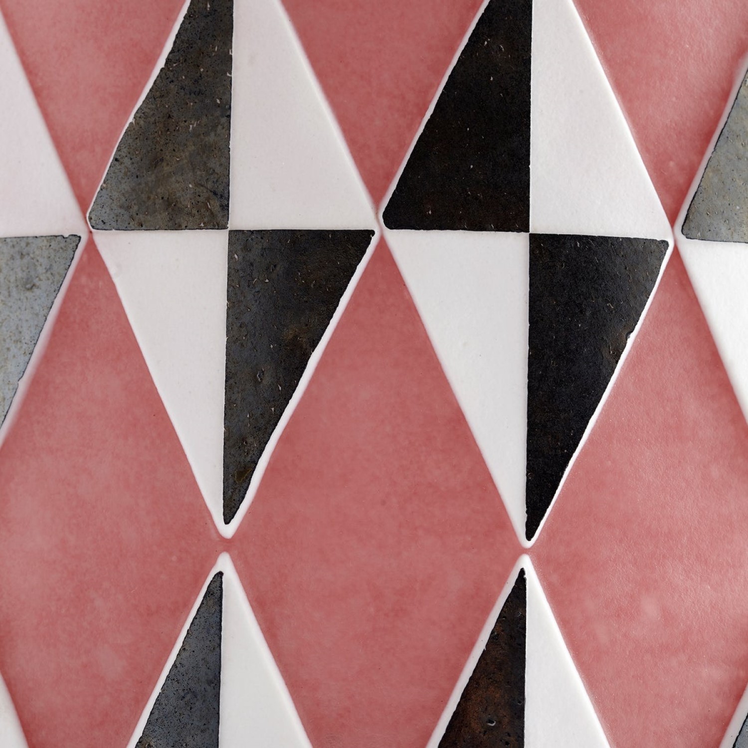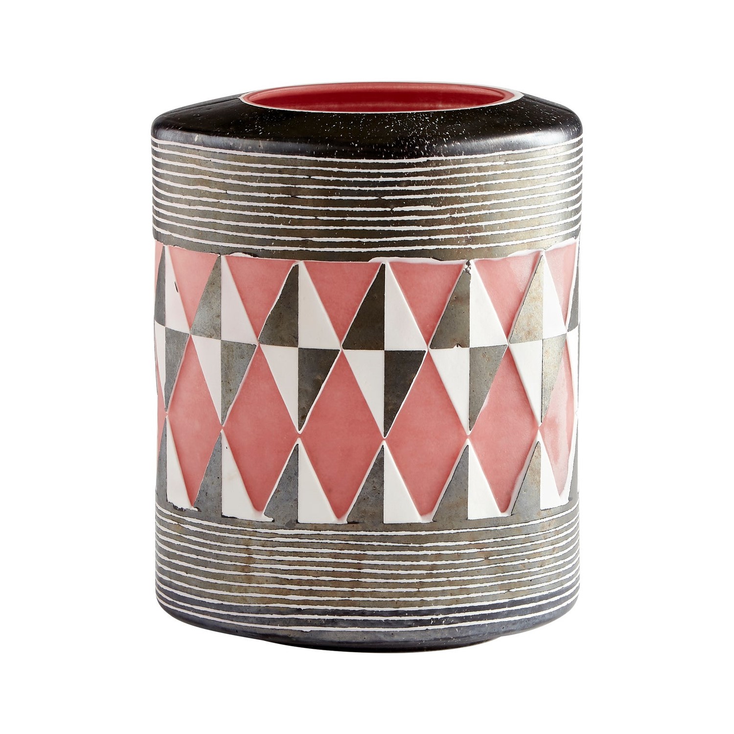 The Small Mesa Vase has a colorful geometric design, with a pink background overlaid with black and white diamonds and a striped pattern anchoring the design at either end. Mesa can hold fresh or artificial flowers, and can be placed on its own or with the Medium and Large Mesa Vases to create a cheerful display that will energize any living or office space.