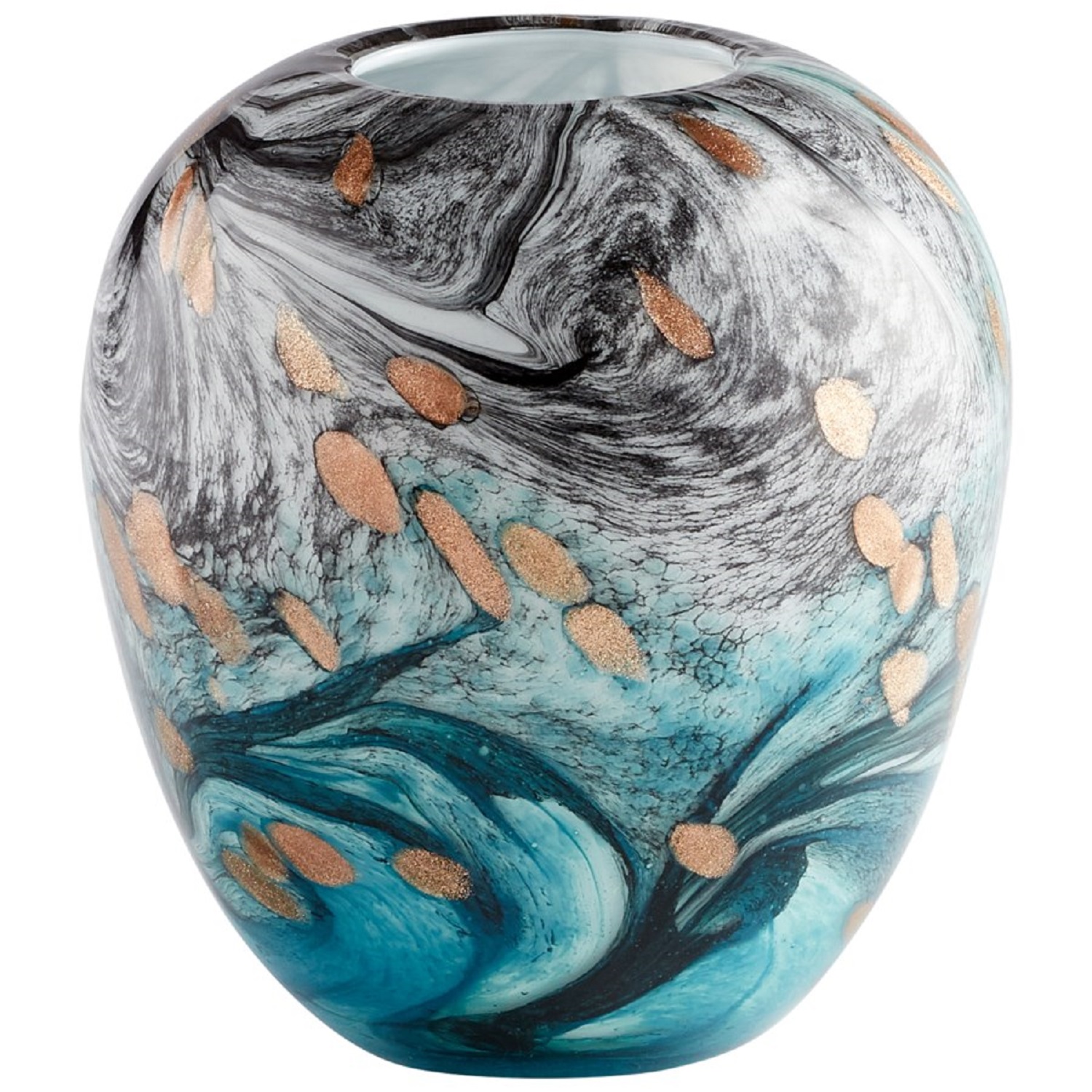 The Small Prismatic Vase features a gradient design in a combination of blue, green, grey, and gold. The splash-like accents of color create a wave-like appearance that is further enhanced by the rounded structure. A unique piece of art that is perfect for display on any tabletop.