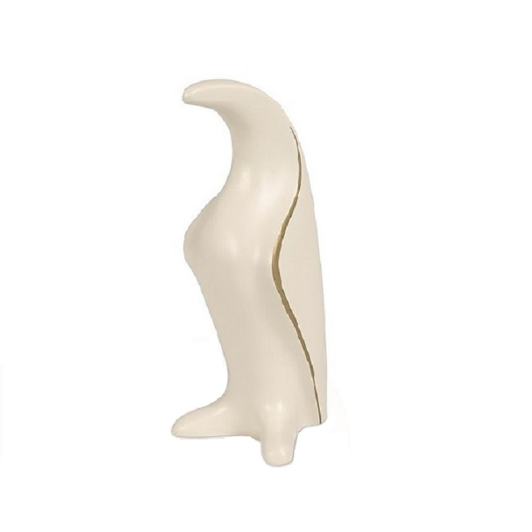 [0] => The Pinkwin sculpture, available in white ceramic with gold lines, features soft contemporary lines and simple, elegant style. This penguin's graceful, sophisticated character distinguishes him as a unique addition to your living, dining, bedroom, or office space.