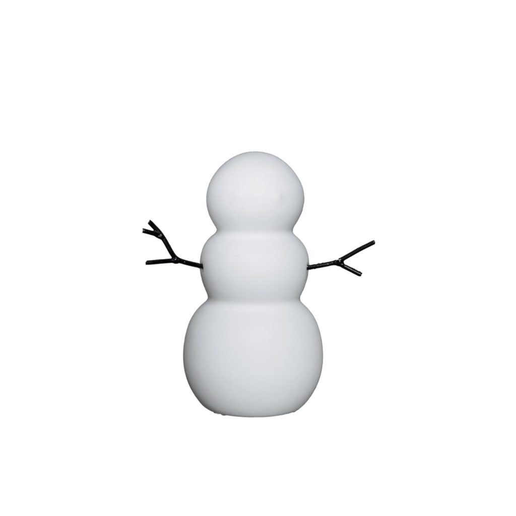 [0] => Bring the joy of winter indoors with the Small White Snowman Figurine. Made of white ceramic and contrasting black metal arms, this figurine features a minimalist appearance perfect for adding an understated accent to any modern holiday display.