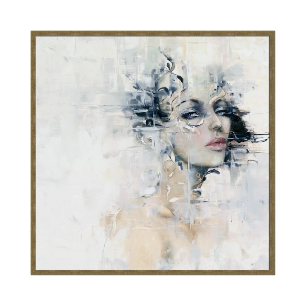 [0] => Intricate facial details and cool, piercing eyes contrast with a blurred, textured background, while pale blues and greys create a monochromatic finish in the Smoke & Mirrors Wall Art. A detailed yet subtle work that inspires thought and whimsy and features gallery-wrapped canvas and a satin bronze shadowbox frame.