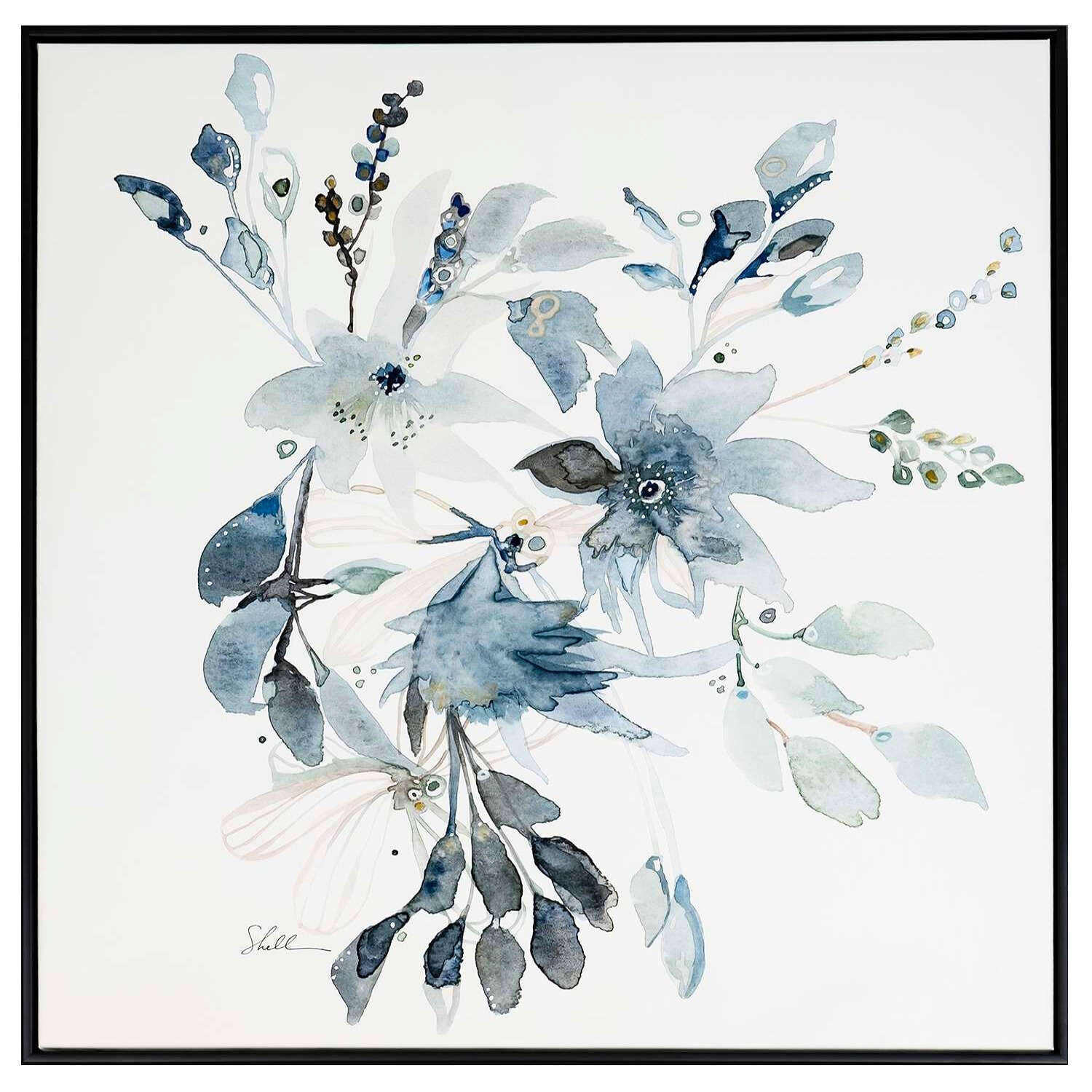 [0] => So Lovely In Hand is a wall artwork depicting a grouping of flowers against a white background. The muted blues and greys of the image create a delicate, nostalgic feel, and the way that the flowers appear to float in the middle of the canvas adds an ethereal touch. Included with a black frame, So Lovely In Hand is perfect for adding a soft and tasteful accent to a bedroom, living room, or office.