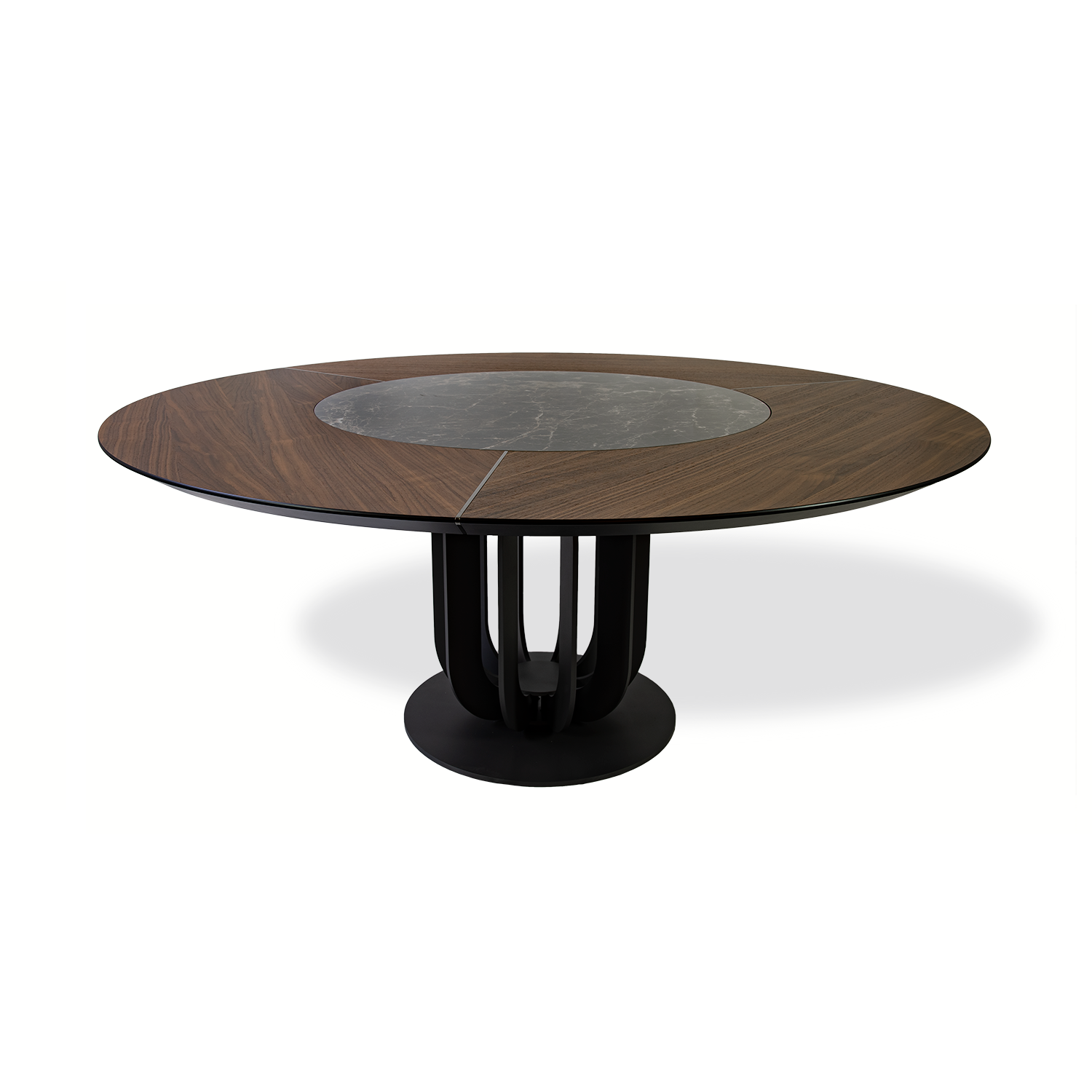 [0] => The Soho Ker-Wood Dining Table, made in Italy, features a smooth Canaletto walnut tabletop with a ring of Emperador ceramic at its center. The graphite cylindrical base makes a bold, sculptural design statement, while also leaving plenty of space underneath the table for comfort. Black chrome accents draw emphasis to the black marbled ceramic center, creating a compelling contrast between the wood, metal, and ceramic elements. For added functionality, the center ceramic ring rotates like a Lazy Susan, allowing you to easily serve your guests.