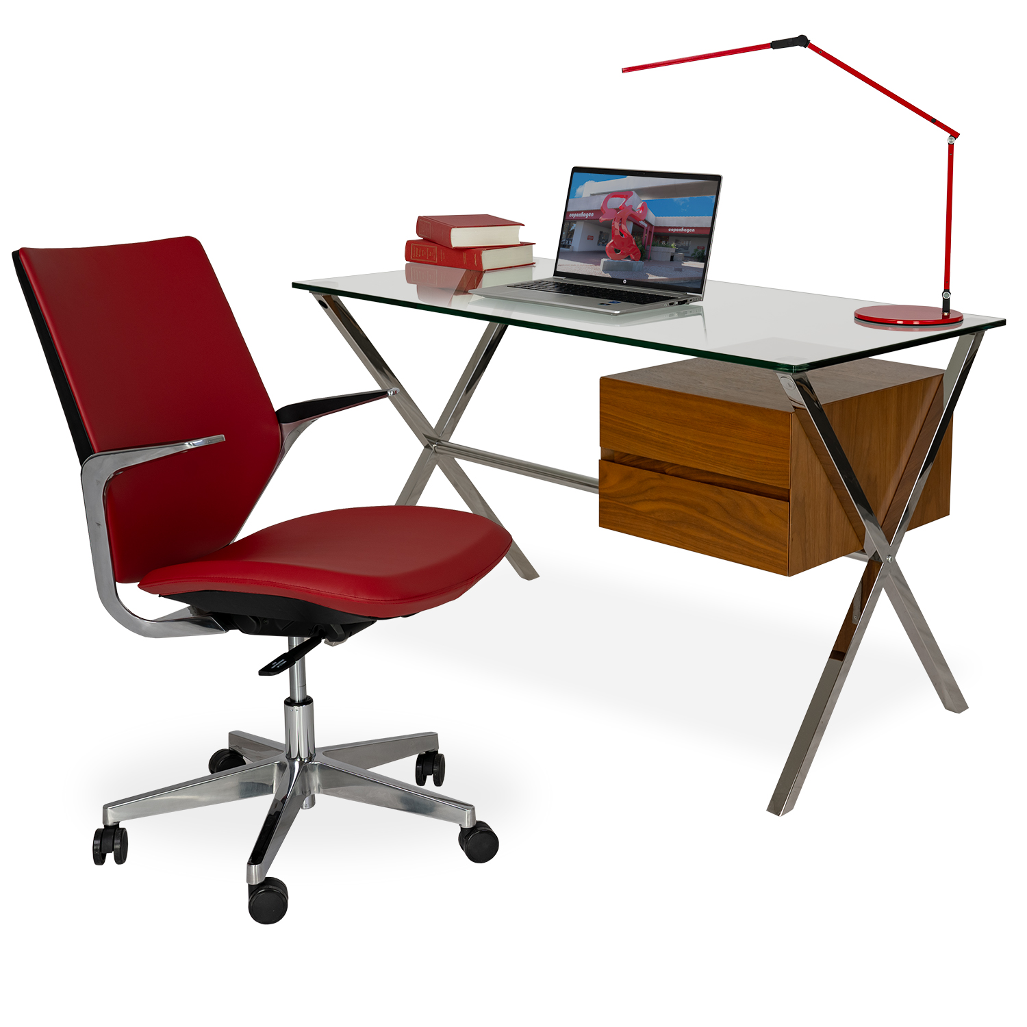 The Solace Desk features a polished steel frame, two storage drawers in a walnut finish, and a clear glass top. With crossed legs connected by a horizontal bar, this desk is bold yet minimalist, and adaptable to nearly any space. The shelving unit appears to hover beneath the glass surface, heightening the feel of clean, elegant design.