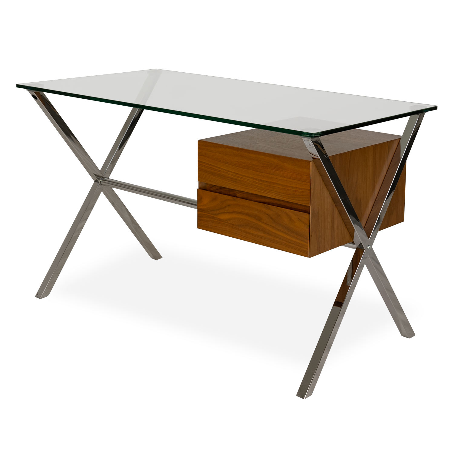 [0] => The Solace Desk features a polished steel frame, two storage drawers in a walnut finish, and a clear glass top. With crossed legs connected by a horizontal bar, this desk is bold yet minimalist, and adaptable to nearly any space. The shelving unit appears to hover beneath the glass surface, heightening the feel of clean, elegant design.