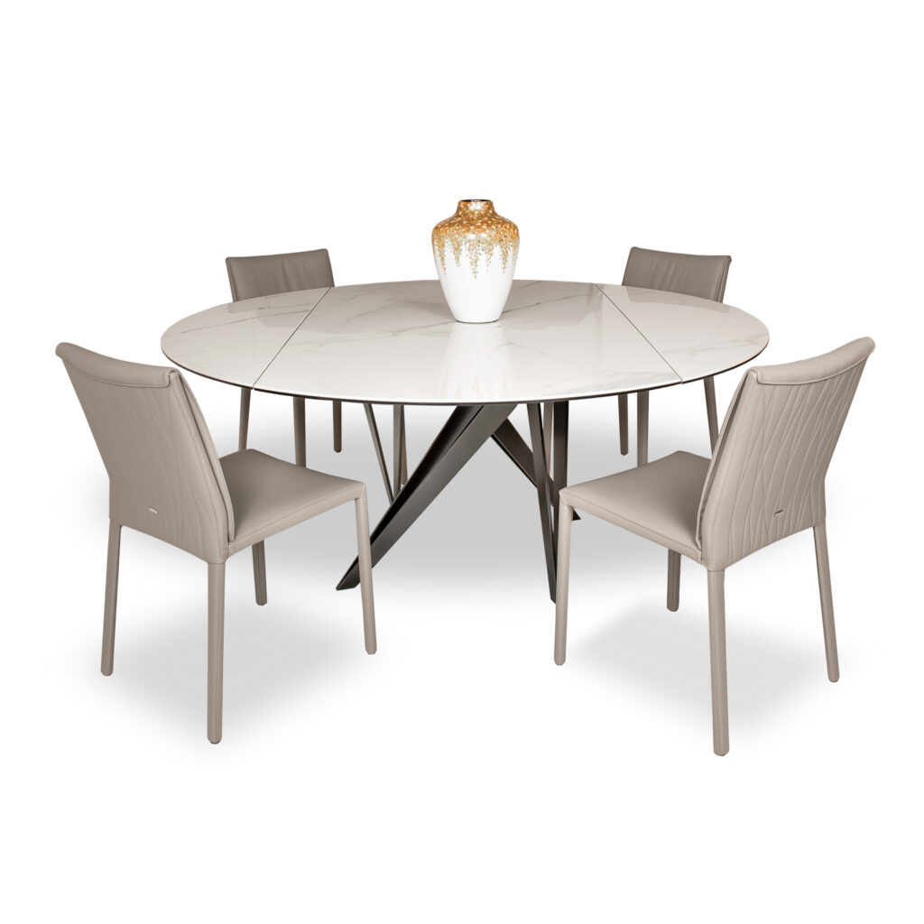 [0] => The Somnia Extendable Dining Table, made in Italy, brings bold geometric lines and effortless functionality to your dining space. Somnia has a round, off-white Statuaro ceramic tabletop that extends to a circle, measuring 71'' all around via double-sided extensions stored beneath. The metallic Manganese legs taper sleekly toward the ground, forming a semi-crossed sculptural base that draws the eye to the artistry of this centerpiece.