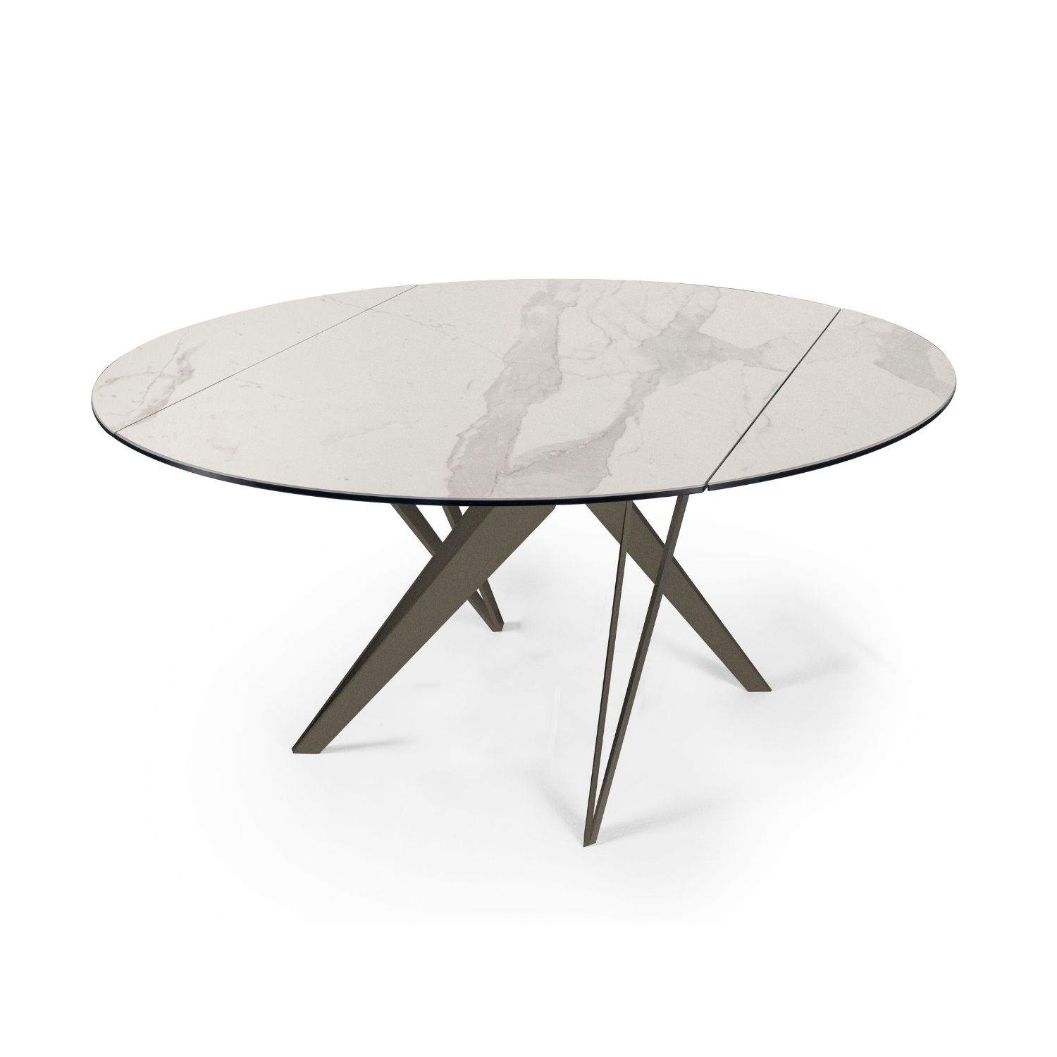The Somnia Extendable Dining Table, made in Italy, brings bold geometric lines and effortless functionality to your dining space. Somnia has a round, off-white Statuaro ceramic tabletop that extends to a circle, measuring 71'' all around via double-sided extensions stored beneath. The metallic Manganese legs taper sleekly toward the ground, forming a semi-crossed sculptural base that draws the eye to the artistry of this centerpiece.