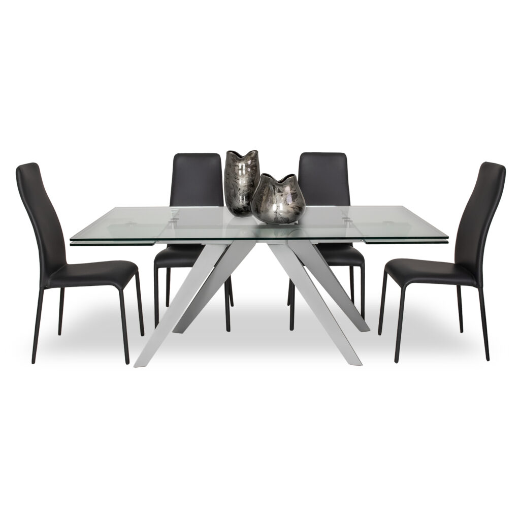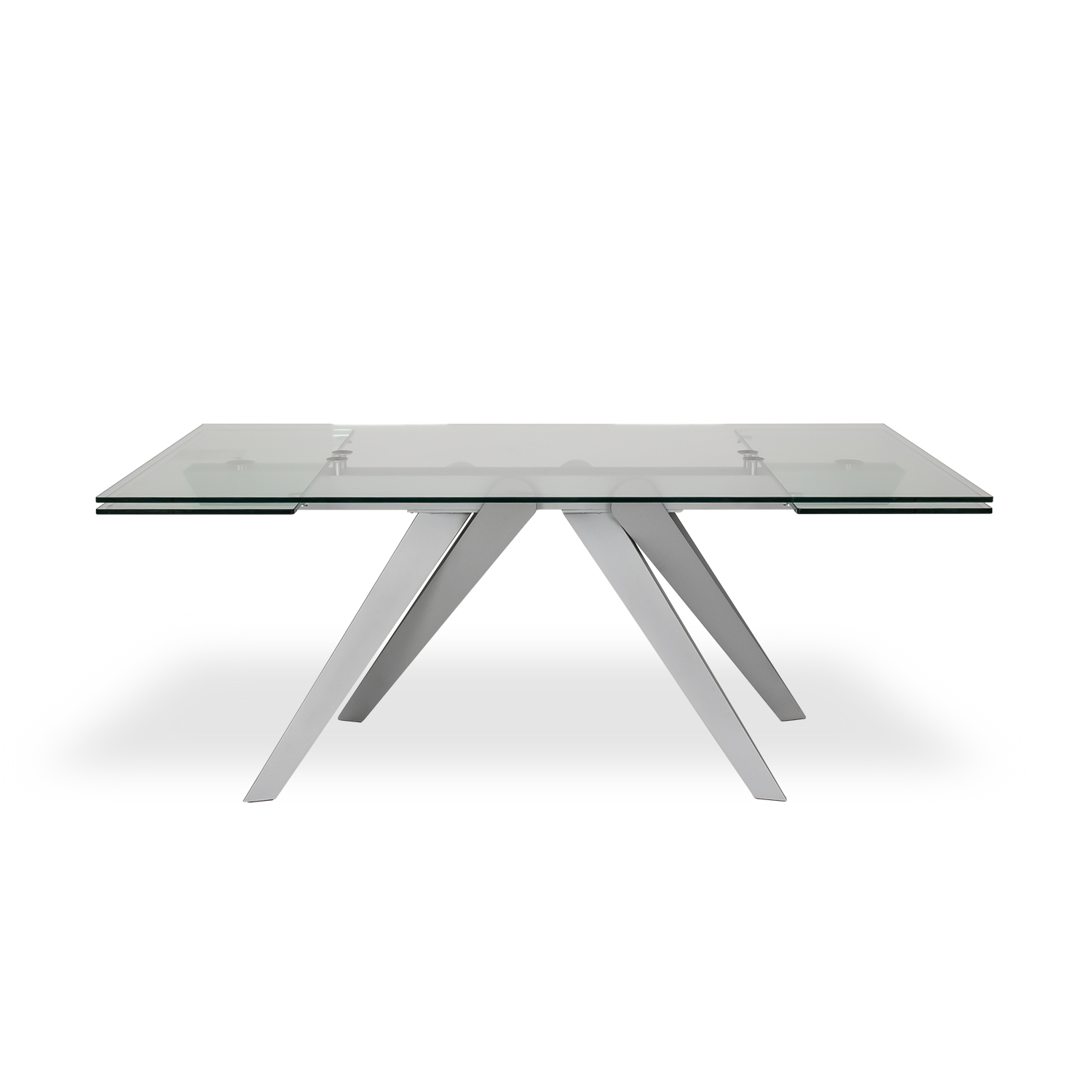 [0] => The Somnia Extendable Dining Table, made in Italy, brings bold geometric lines and effortless functionality to your dining space. Somnia has a clear, rectangular glass tabletop that extends up to 102.3'' via double-sided extensions stored beneath. The embossed aluminum legs taper sleekly toward the ground, forming a semi-crossed sculptural base that draws the eye to the artistry of this centerpiece.